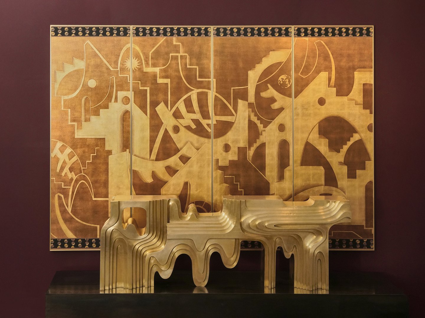 Golden Arc, a solid console, a bench and a seat in patinated gold finish. These represent a new language for the studio, and have an architectural quality explored through intersecting surfaces, arches and columns.