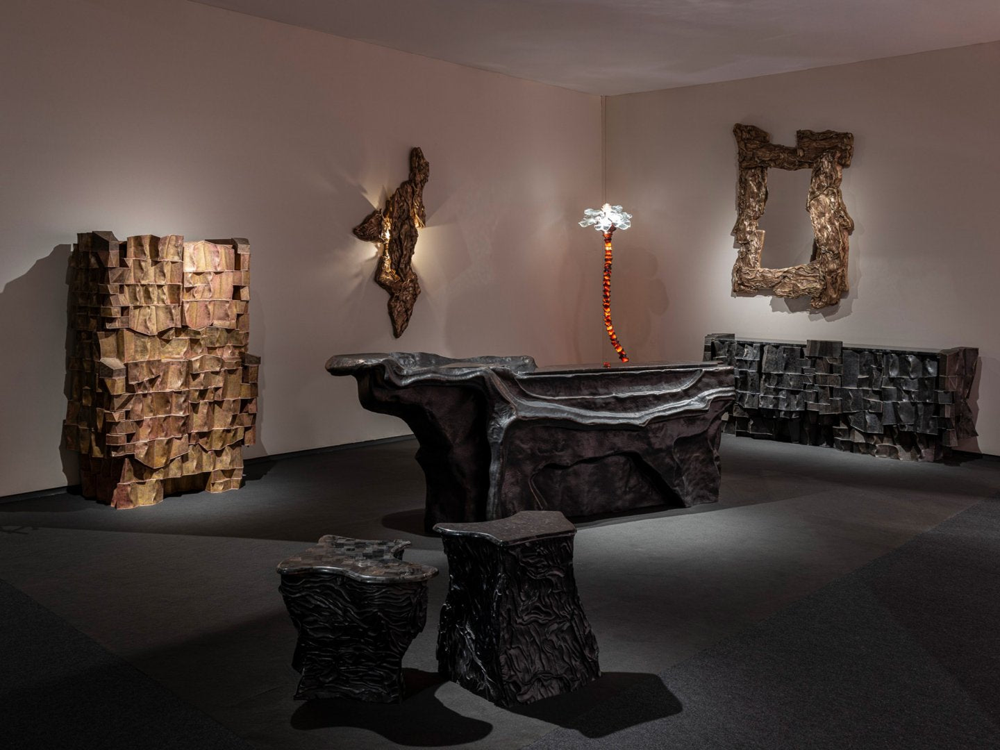 The hero exhibit, the large Mesa console, is made from brass and topographical in its textures, evoking the contours of the earth from a bird’s eye view.