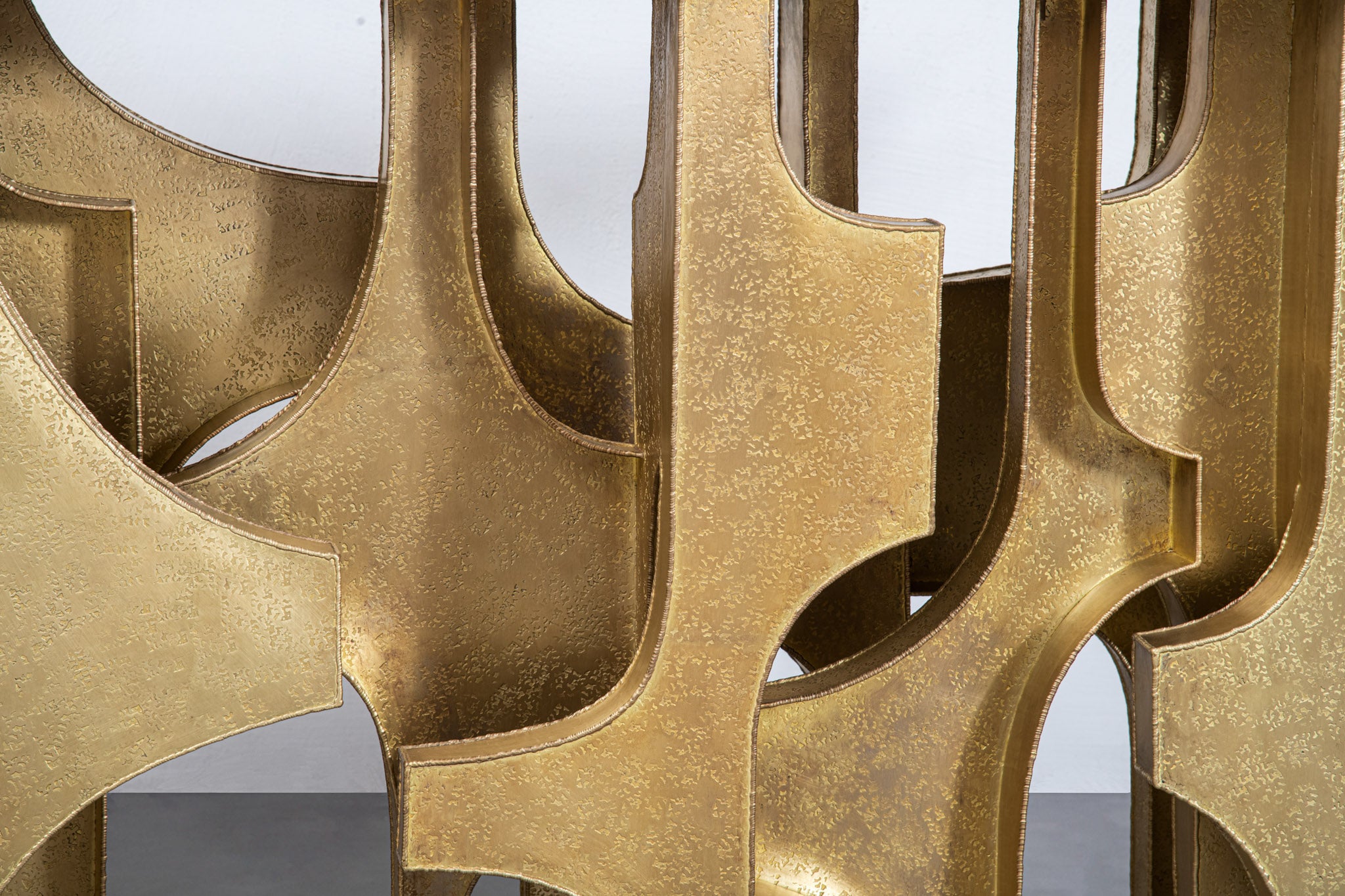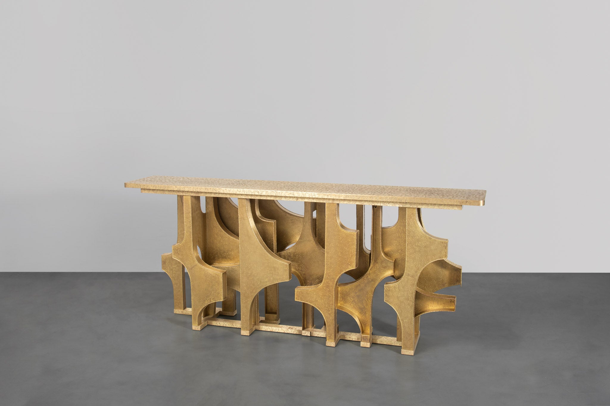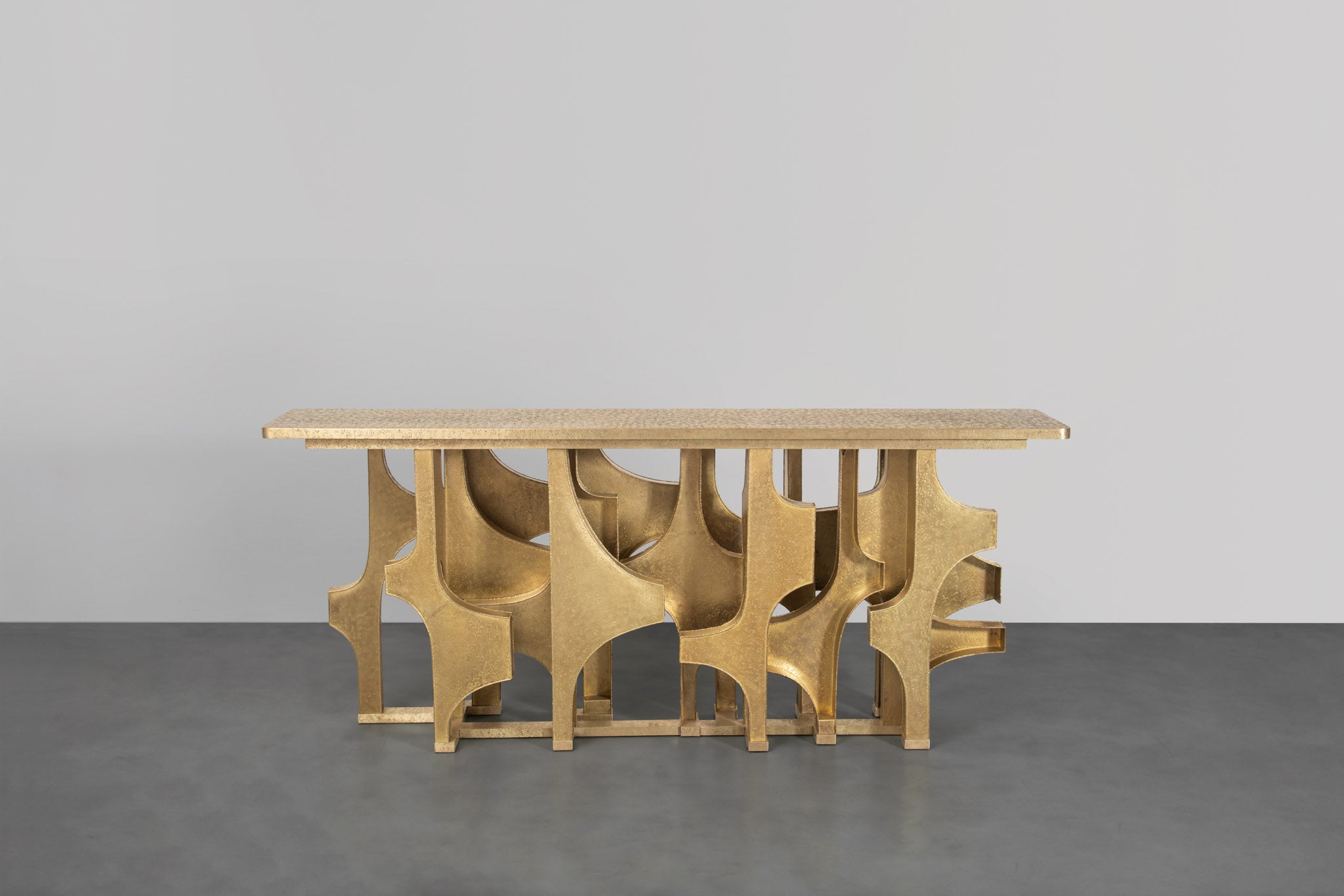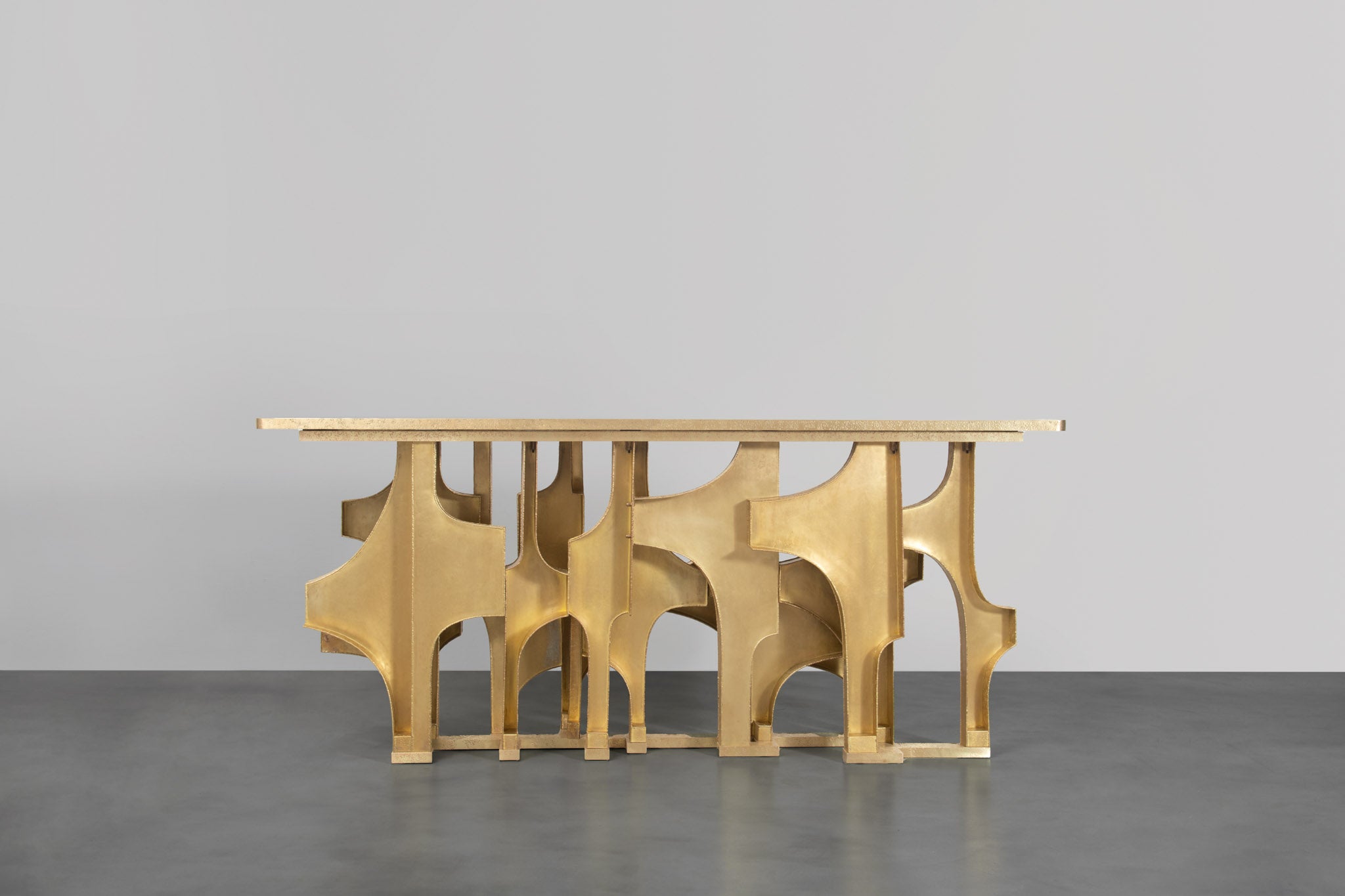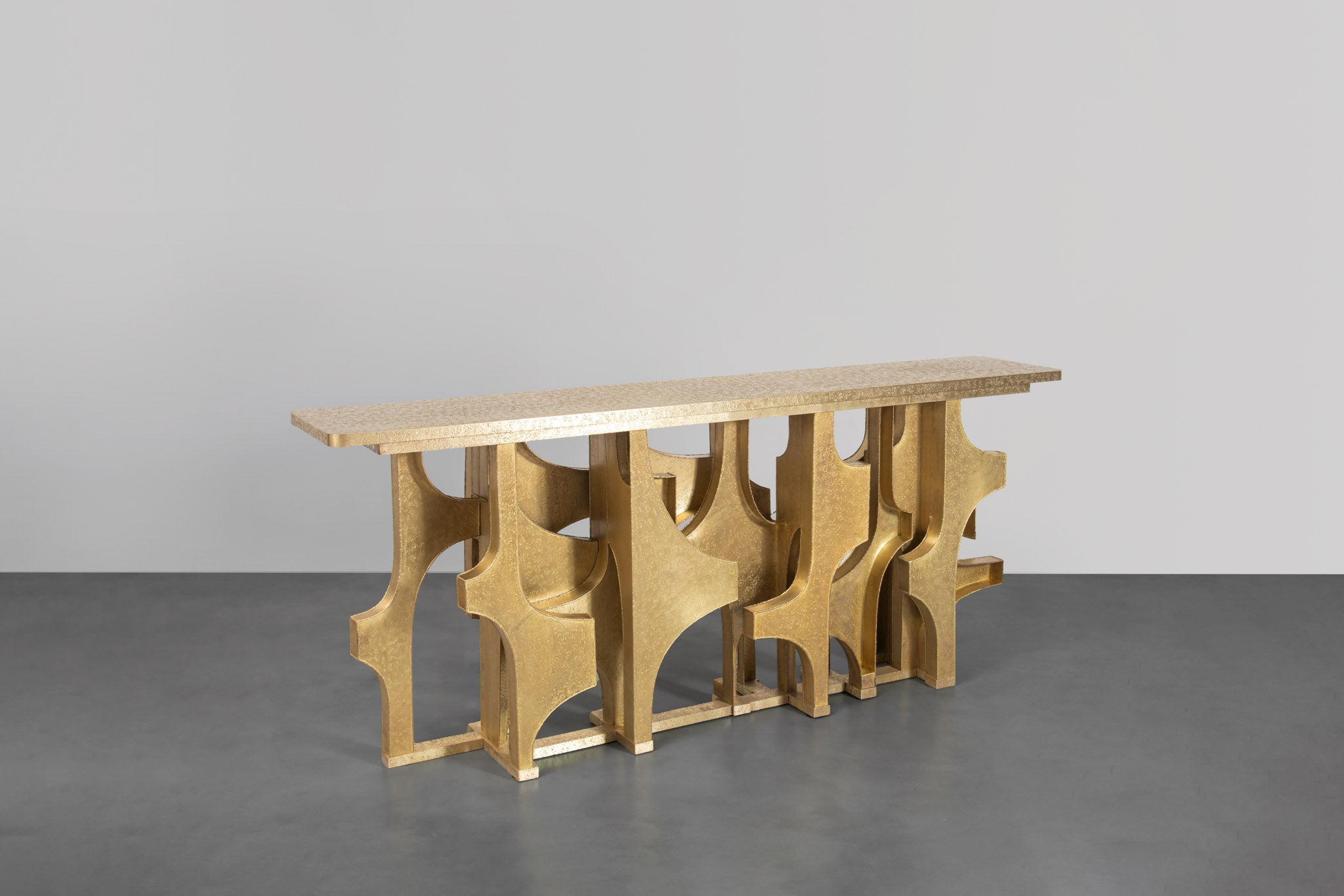 The multifoil arches that prevail in Rajput architecture form the inspiration behind the Amber. The layers of this patinated brass console run deep; from the hand-embossed surface textures, to the cutting and welding that brings together its myriad legs.