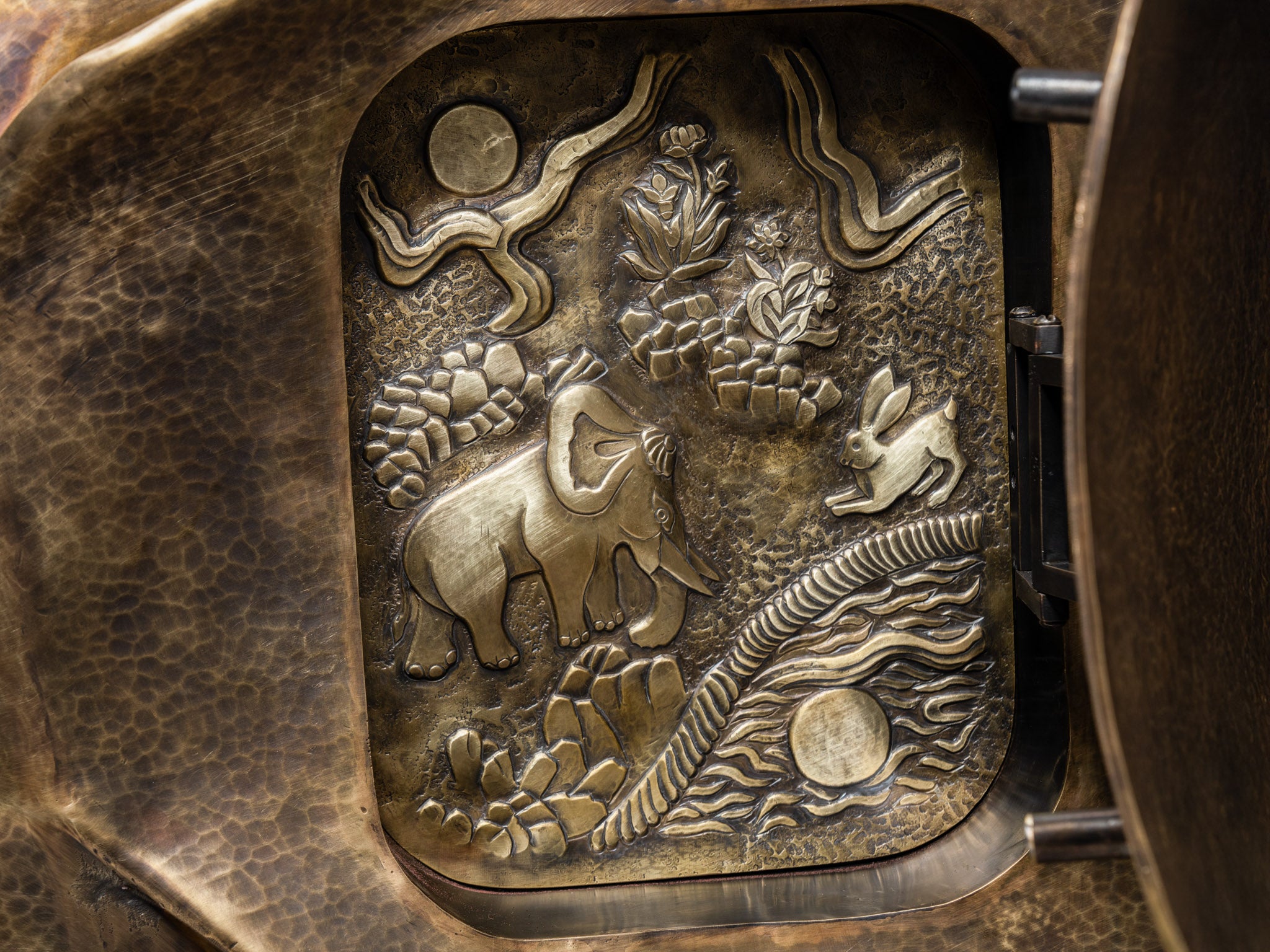 The elephantine scale and heft are imagined through a console: steadfast, grounding, and gracefully poised. Its generous surface offers practical space, an invitation to gather, display, or pause in contemplation. Within its sculpted form one encounters the Panchatantra fable of The Elephant and the Hare — where wit triumphs over might, reminding us that true power is often measured by the mind, not the body.