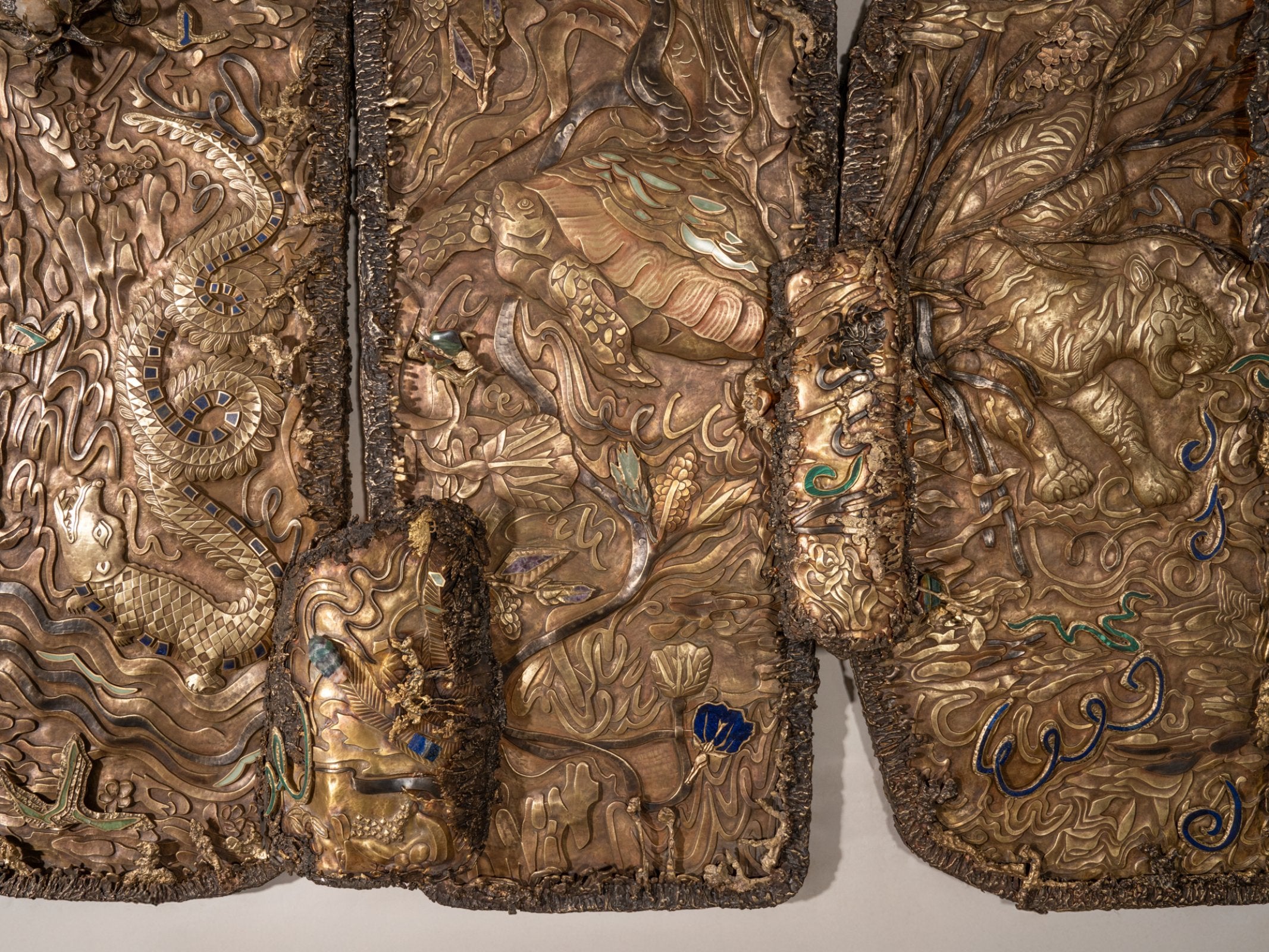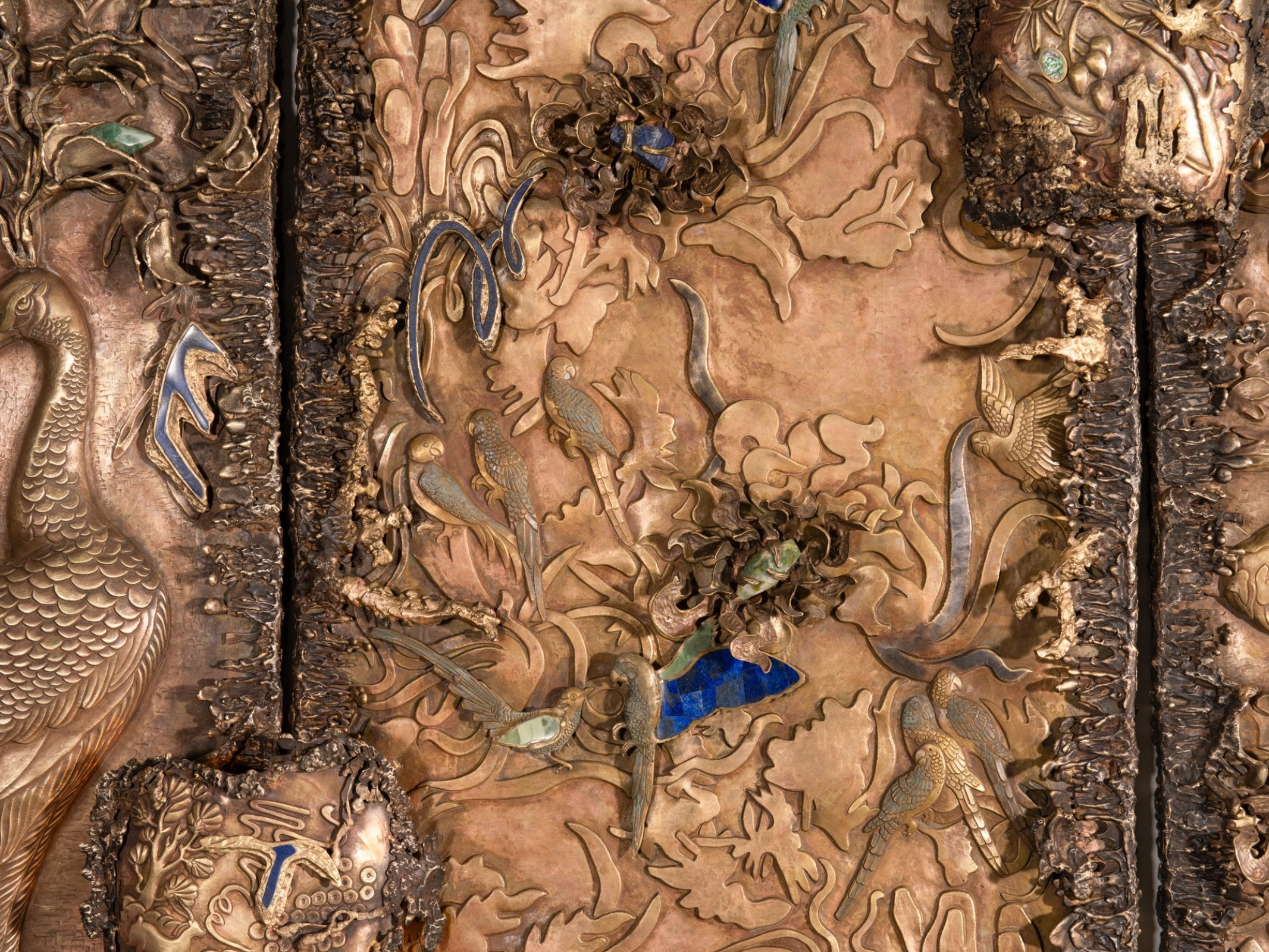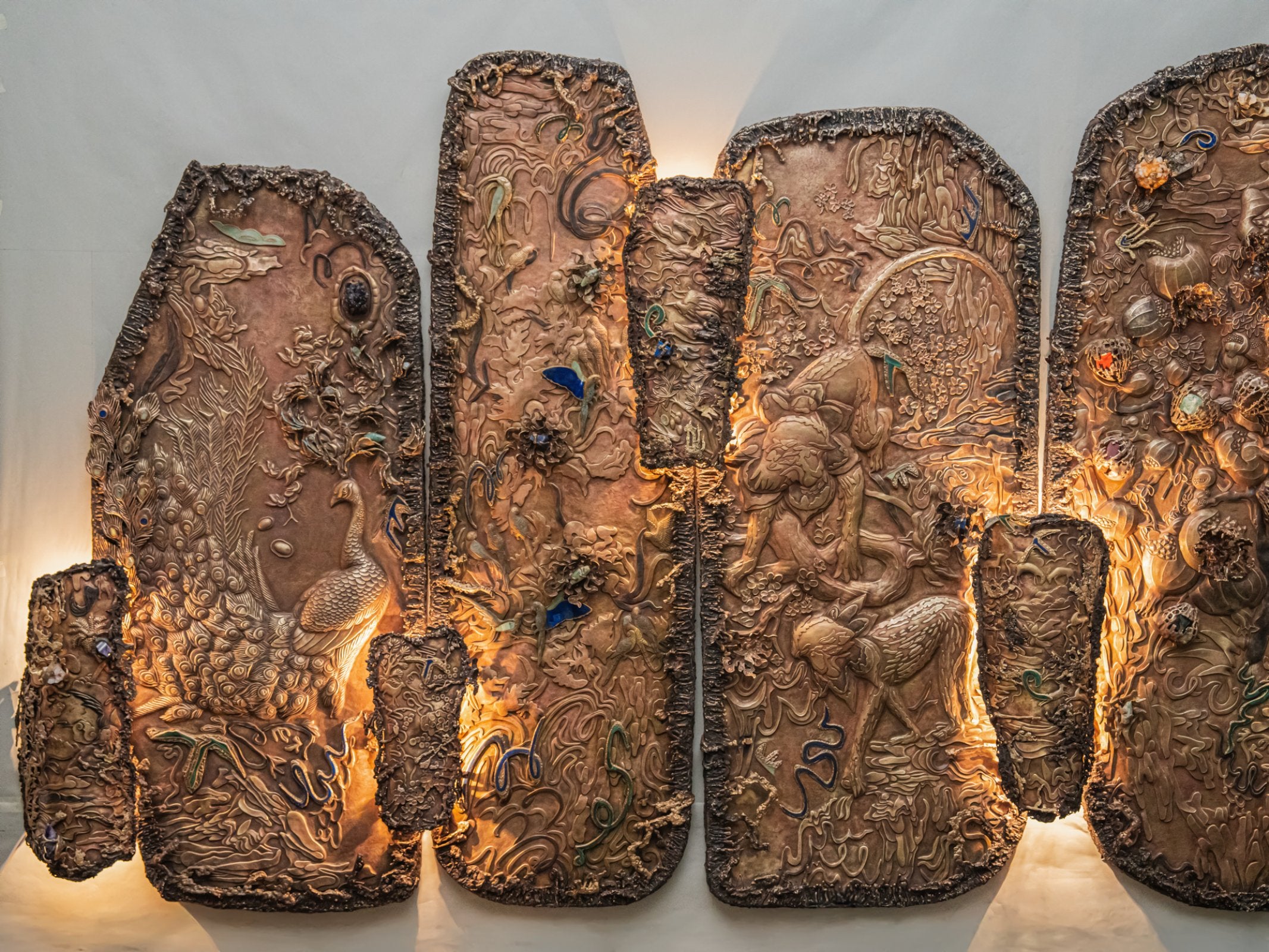 Garden of Life, is a monumental multi-panel wall mural that pays homage to the beauty of nature and mythology through intricate craftsmanship. Standing at 9‘ tall and 22‘ wide, the composition unfolds across large richly detailed sections, each teeming with flora and fauna that hold deep significance in Indian mythology: peacocks in their full, resplendent plume; blackbucks gracefully poised; Gajasimha, the mythical lion-elephant hybrid; parrots nesting and in flight; playful monkeys in joyful congregation; and a tiger moving in quiet stealth behind trees. The pomegranate tree, a symbol of fertility and abundance, addresses this lush narrative.