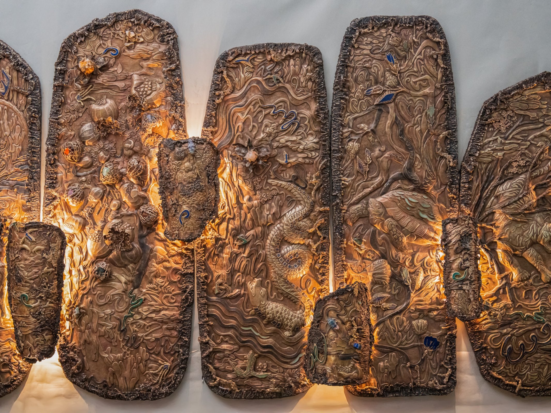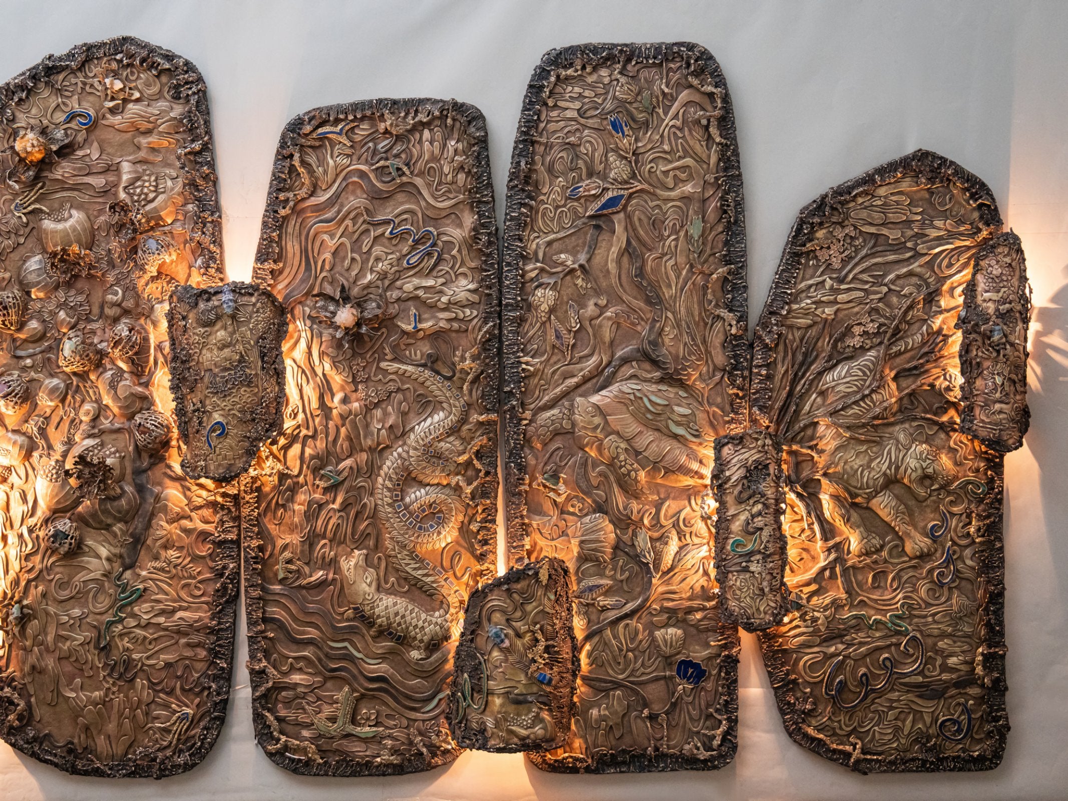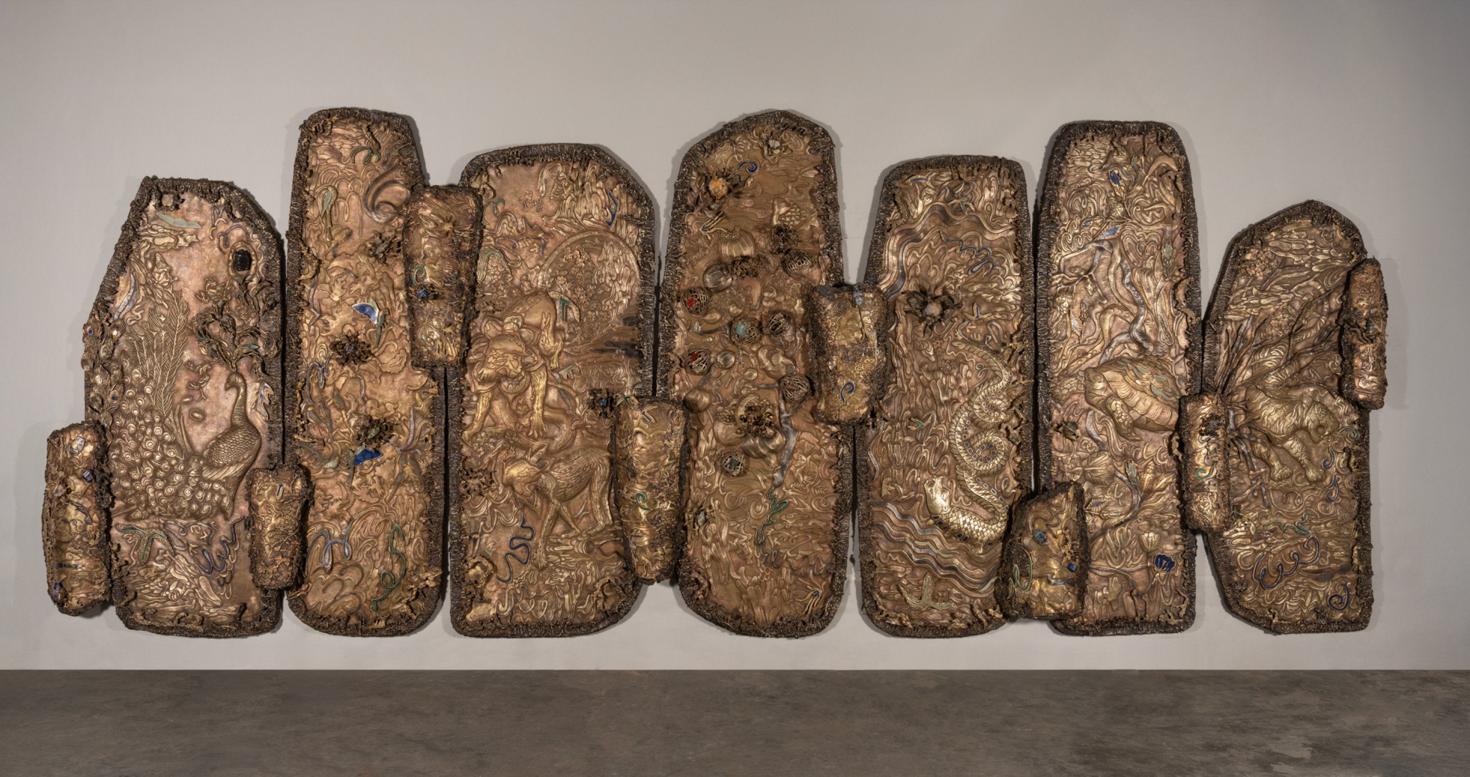 Garden of Life, is a monumental multi-panel wall mural that pays homage to the beauty of nature and mythology through intricate craftsmanship. Standing at 9‘ tall and 22‘ wide, the composition unfolds across large richly detailed sections, each teeming with flora and fauna that hold deep significance in Indian mythology: peacocks in their full, resplendent plume; blackbucks gracefully poised; Gajasimha, the mythical lion-elephant hybrid; parrots nesting and in flight; playful monkeys in joyful congregation; and a tiger moving in quiet stealth behind trees. The pomegranate tree, a symbol of fertility and abundance, addresses this lush narrative.