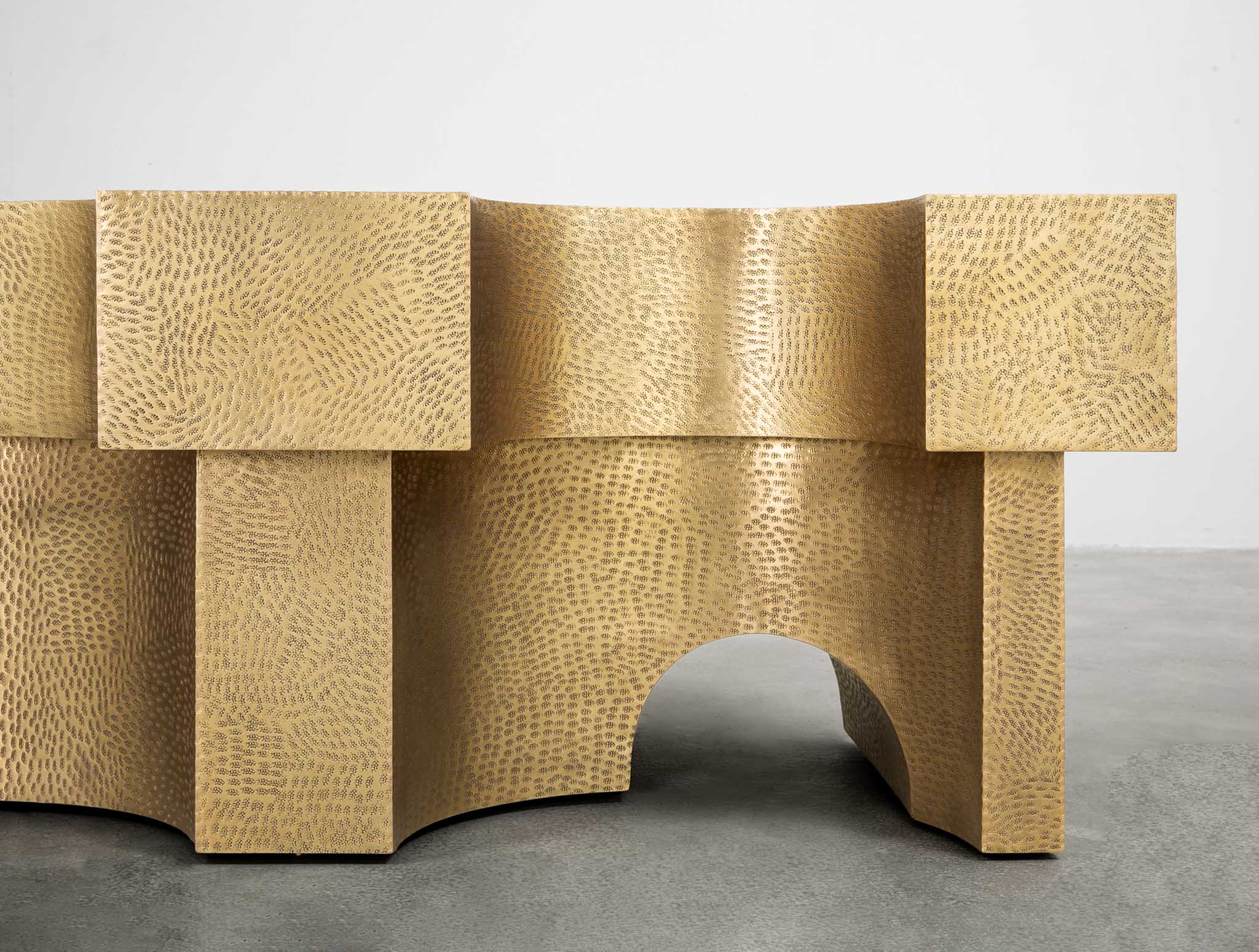 Italian for “great castle”, the Grand Castello console draws from the architectural language of fortified structures, where volume, structure and balance conveyed both power and permanence. Handhammered and sculpted using the studio’s metal cladding technique, its curving facades take shape from metal sheets formed into arched, volumetric silhouettes—an homage to the elegance of built form, encapsulated in patinated brass.