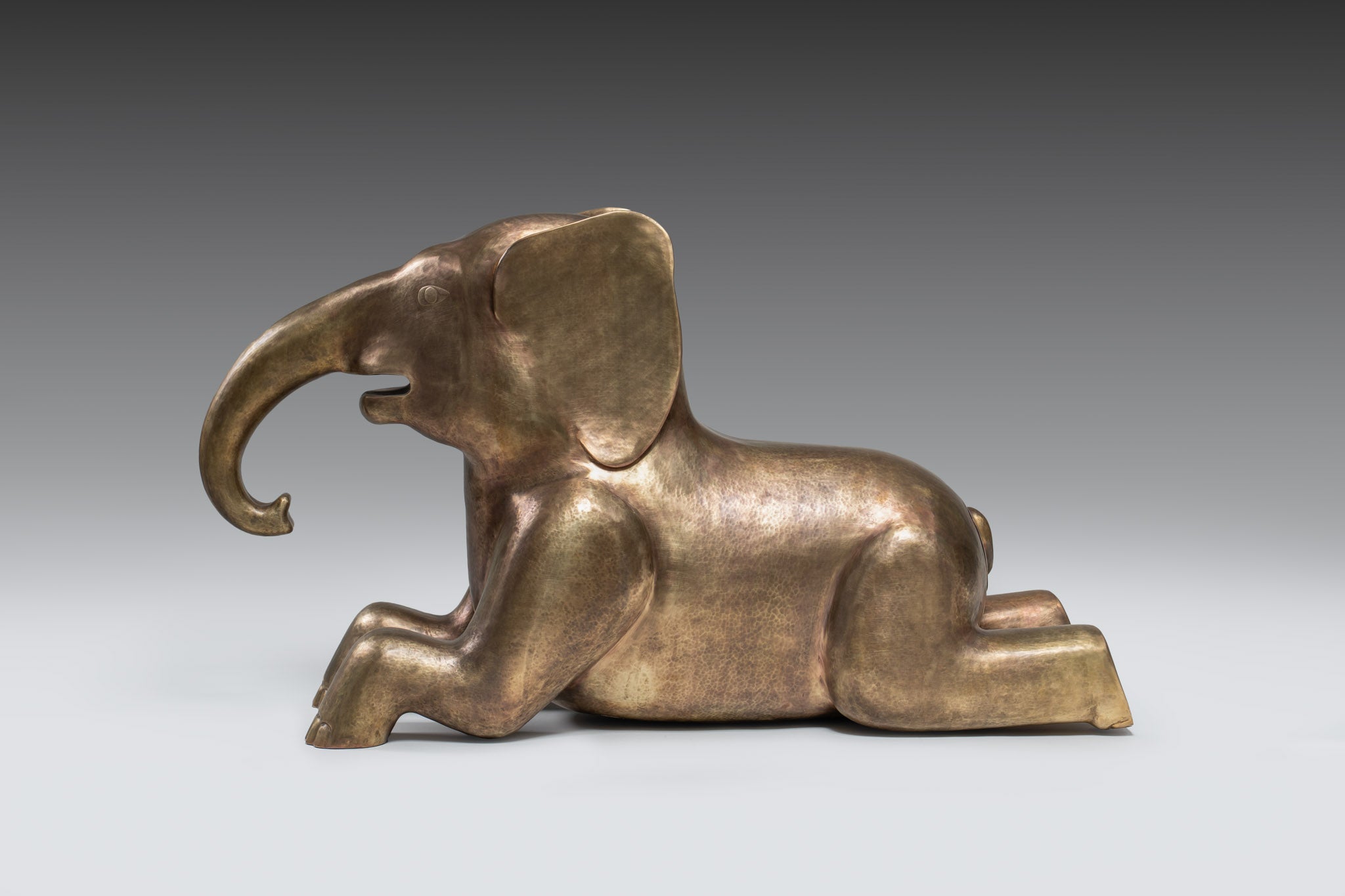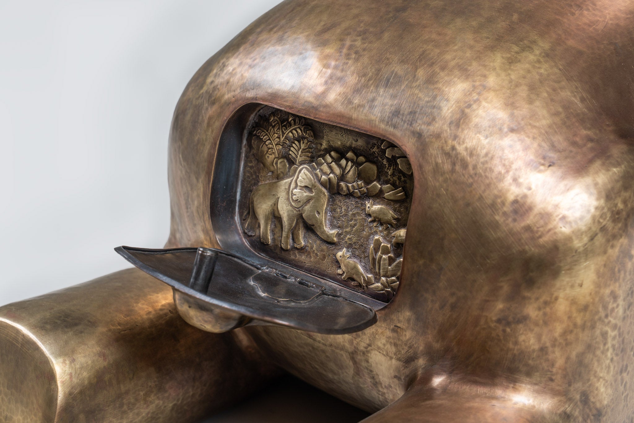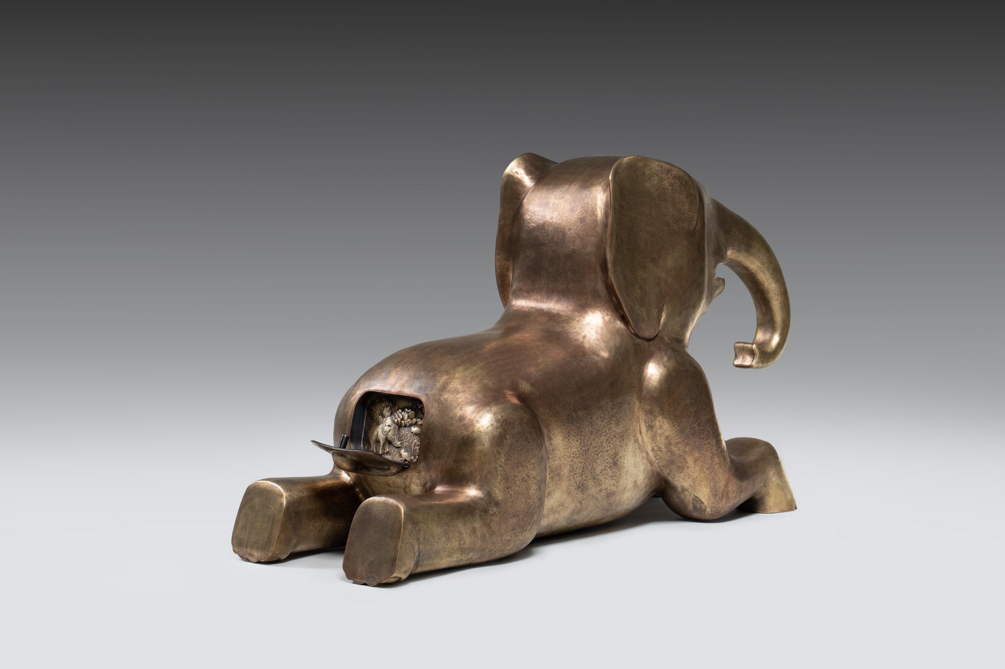 From the tranquil forests of India, a baby elephant sits at ease — playful, unguarded, and full of spirit. In Indian lore, young elephants symbolize harmony, carrying within them a gentleness that reflects nature’s balance: innocence holding its own alongside strength. In our studio, this infant becomes a playful seating, both inviting and lighthearted. Its rounded form offers rest, its presence bringing levity into a space. Hidden within its sculpted body lies a Panchatantra fable — the tale of The Mice and the Elephant — where kindness begets kindness, proving that no act of compassion is ever too small to matter. Crafted in brass through a union of hollowed joinery and intricate repoussé, the baby elephant blends play with purpose. More than an object, it is a tender companion in the unspoken language of care that binds beings together.