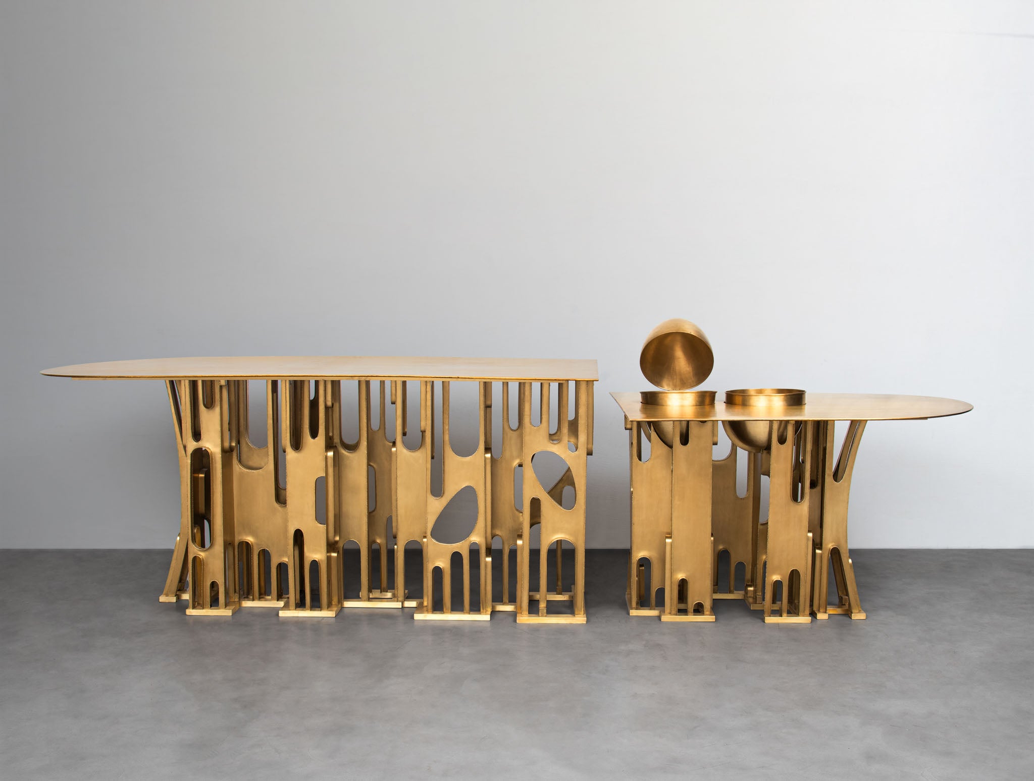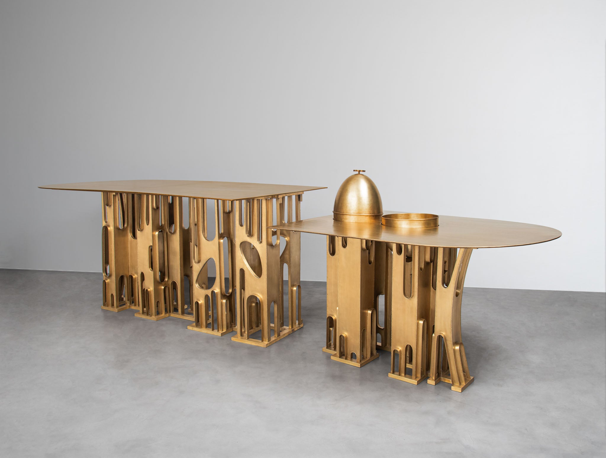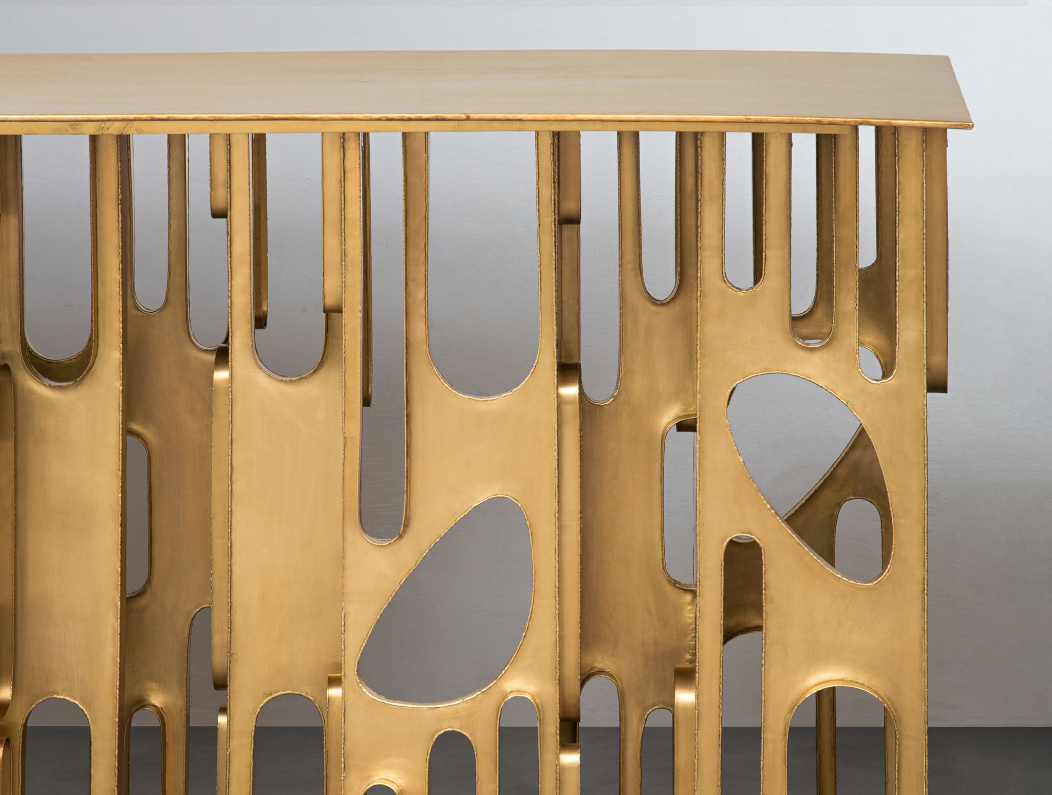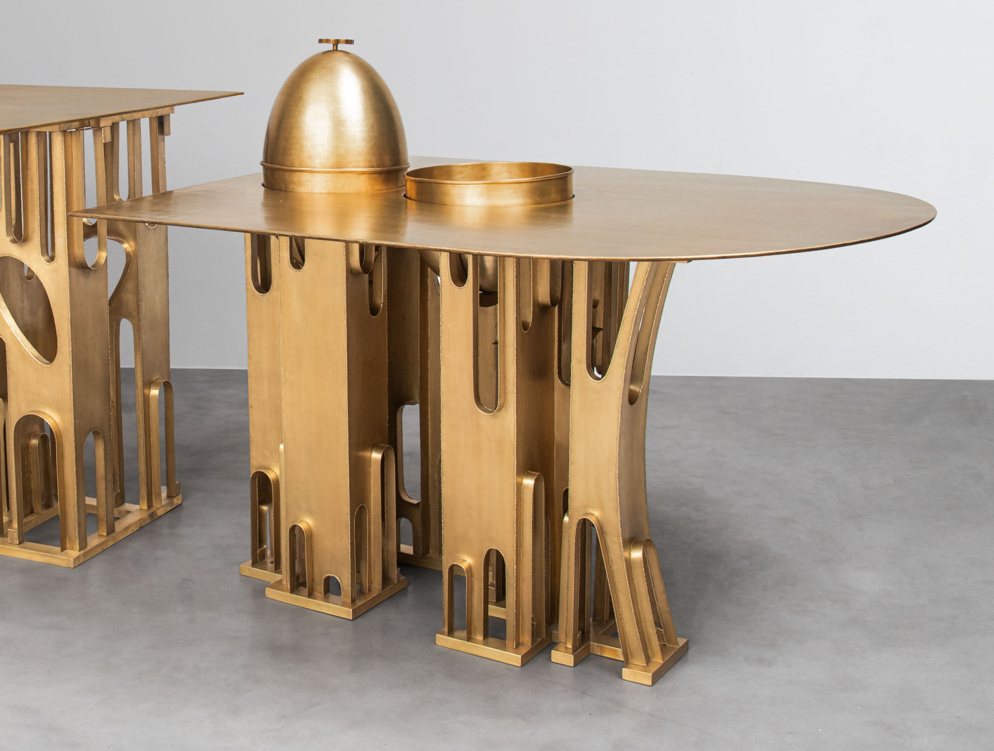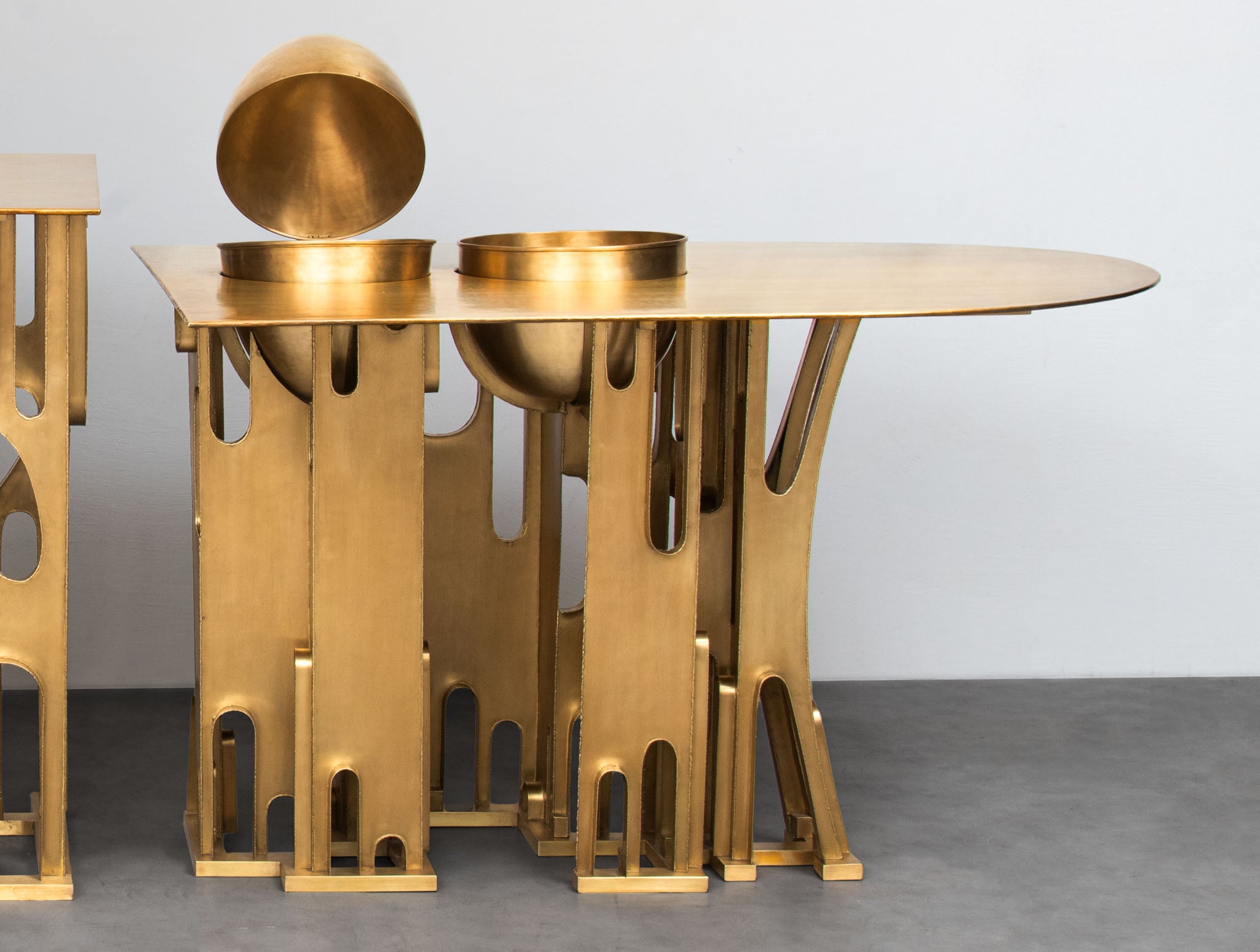 Defying traditional symmetry, this piece echoes the iconic spirit of the French artist duo Les Lalanne (Claude and François-Xavier). Its distinctive split-bar design showcases columnar brass legs with sculptural cut-outs, expertly crafted through precise cutting and welding, and finished in a rich, patinated gold.
