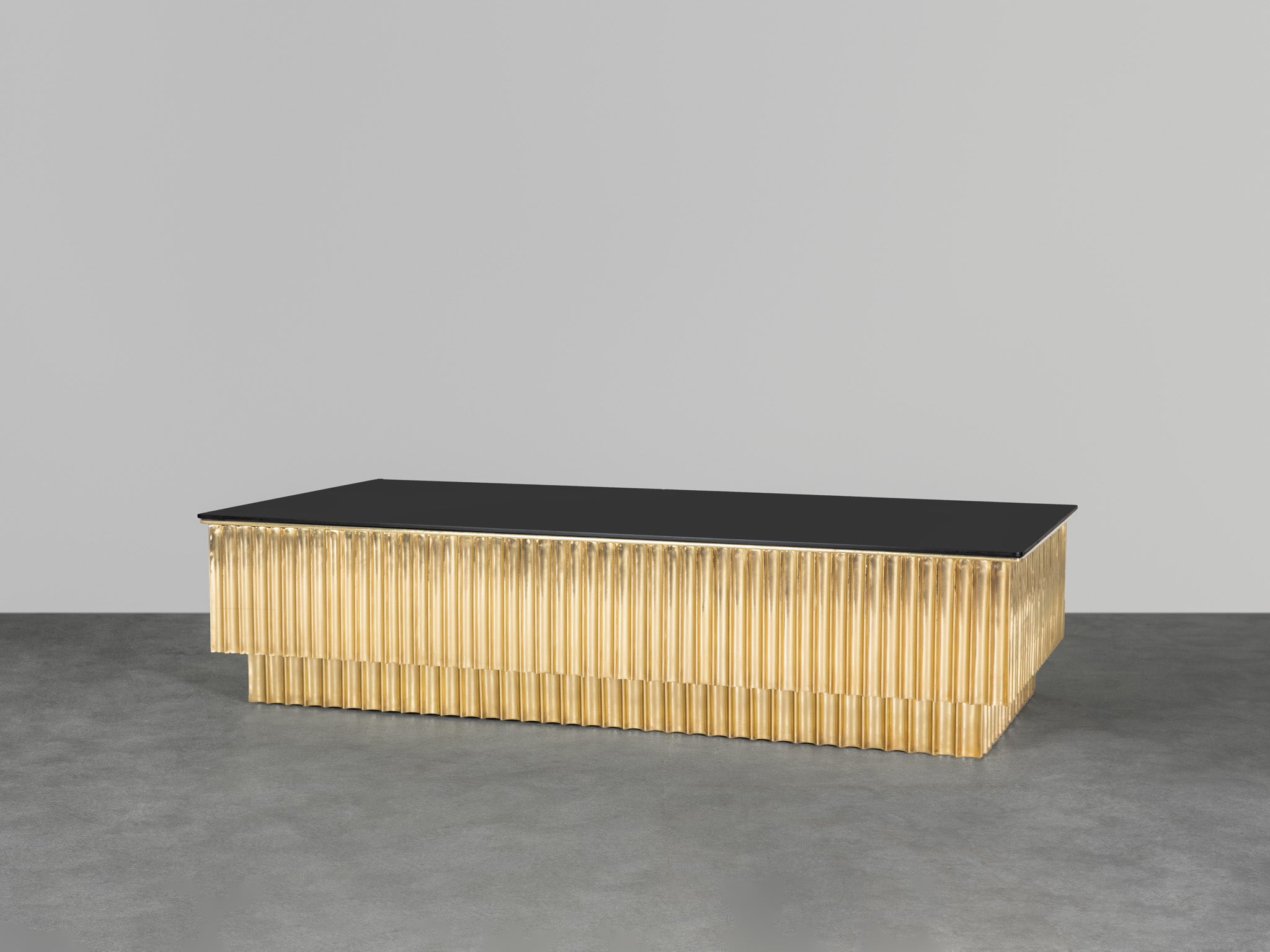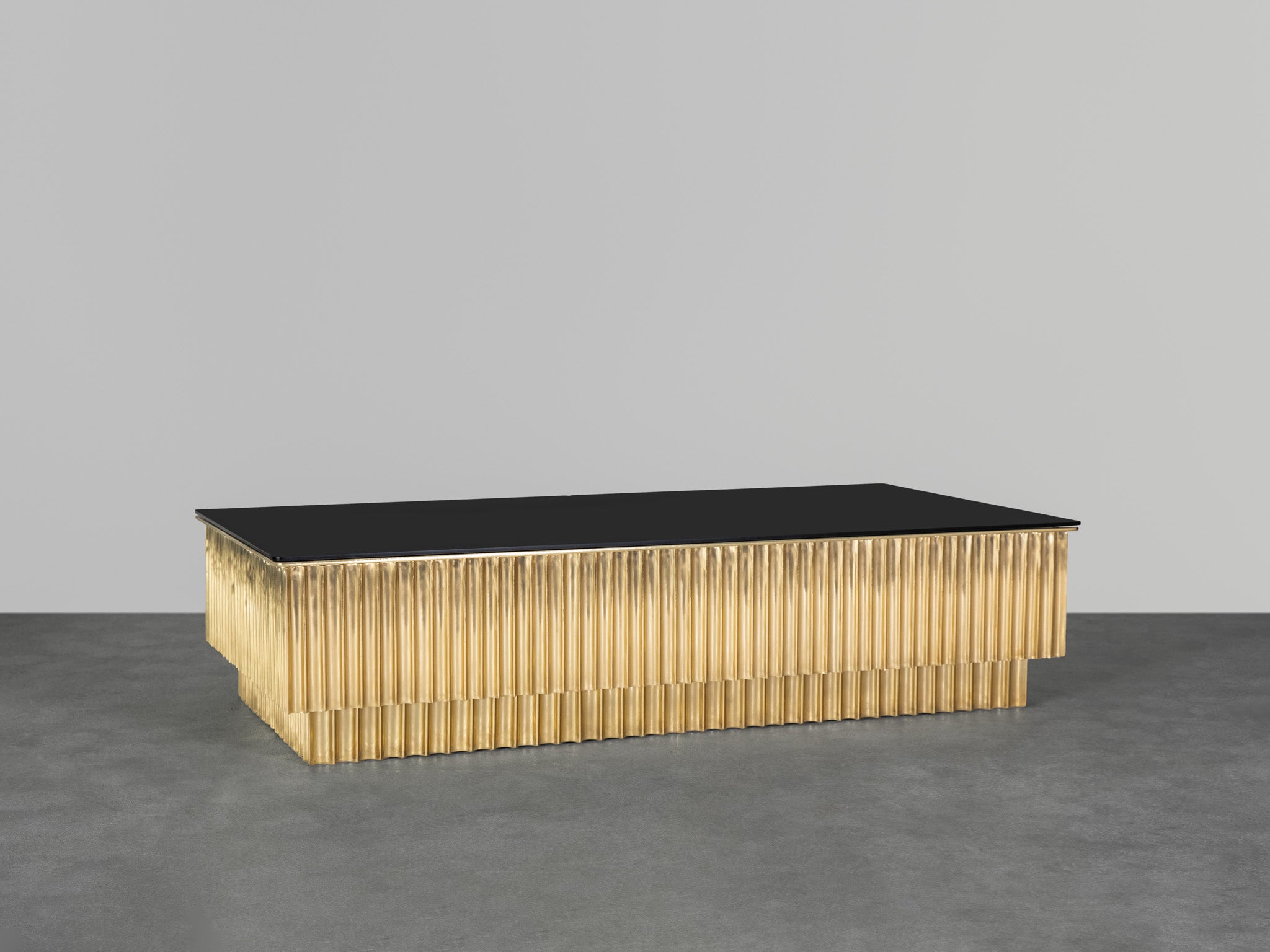 With an organic facade made of fluted brass, this sculptural coffee table is inspired by Art Deco. Breaking away from the traditional confines of geometry, the table explores the dynamism of sheet brass and the highly-skilled technique of fluting, in which smooth metal sheets are scored with lines or breaks.