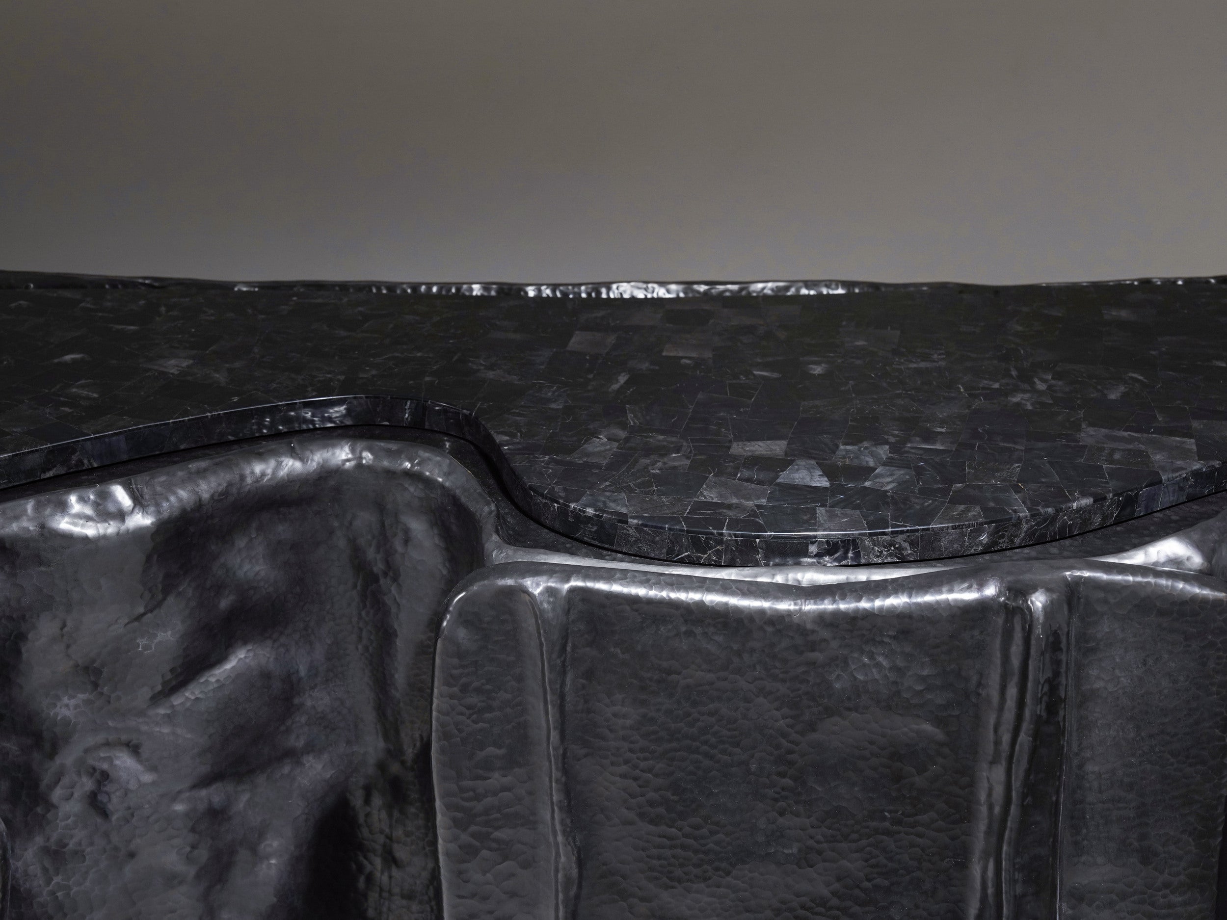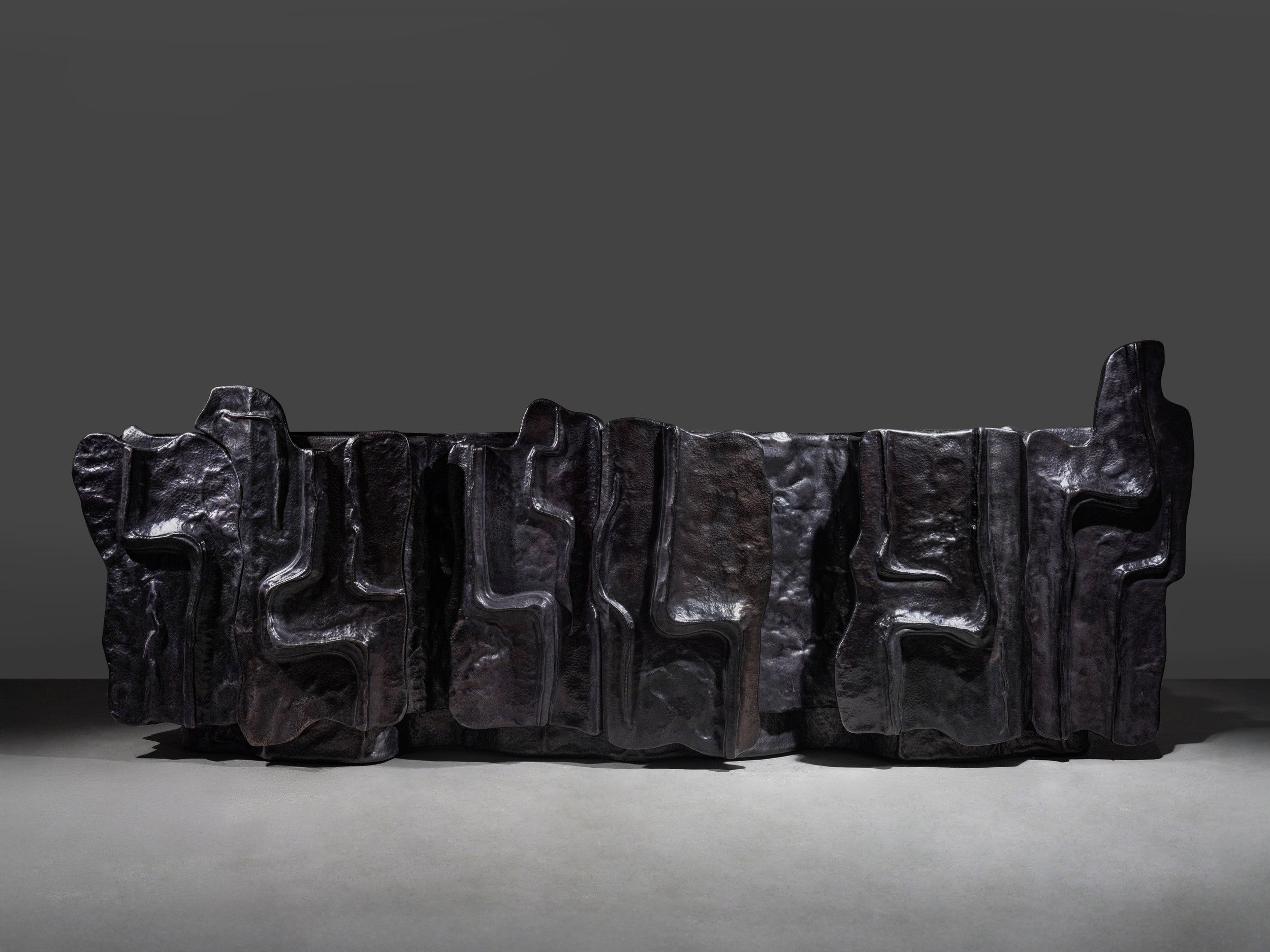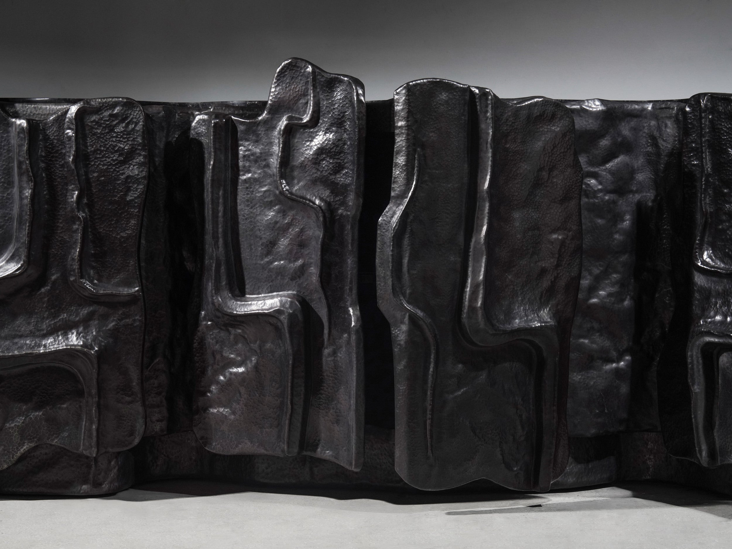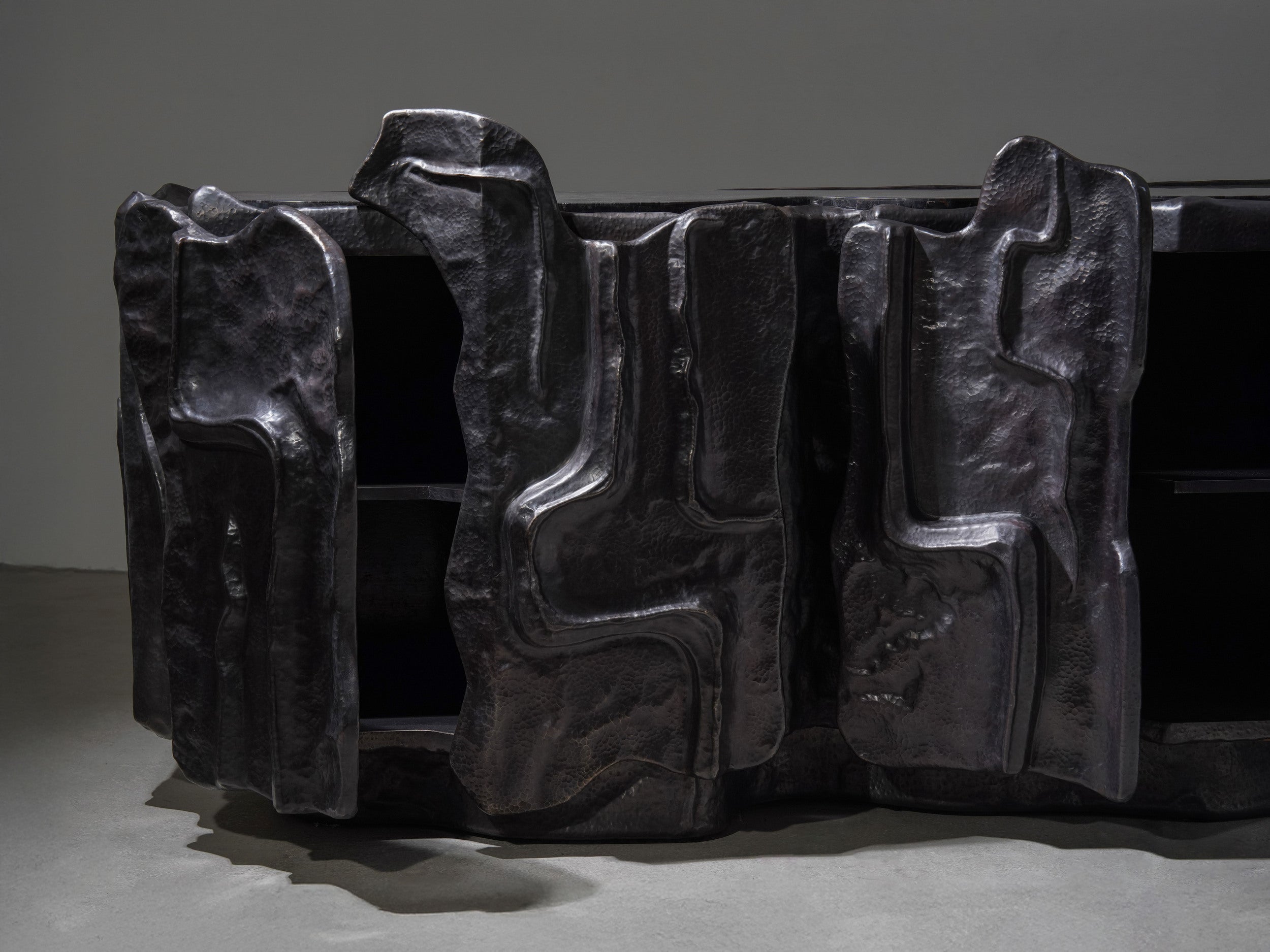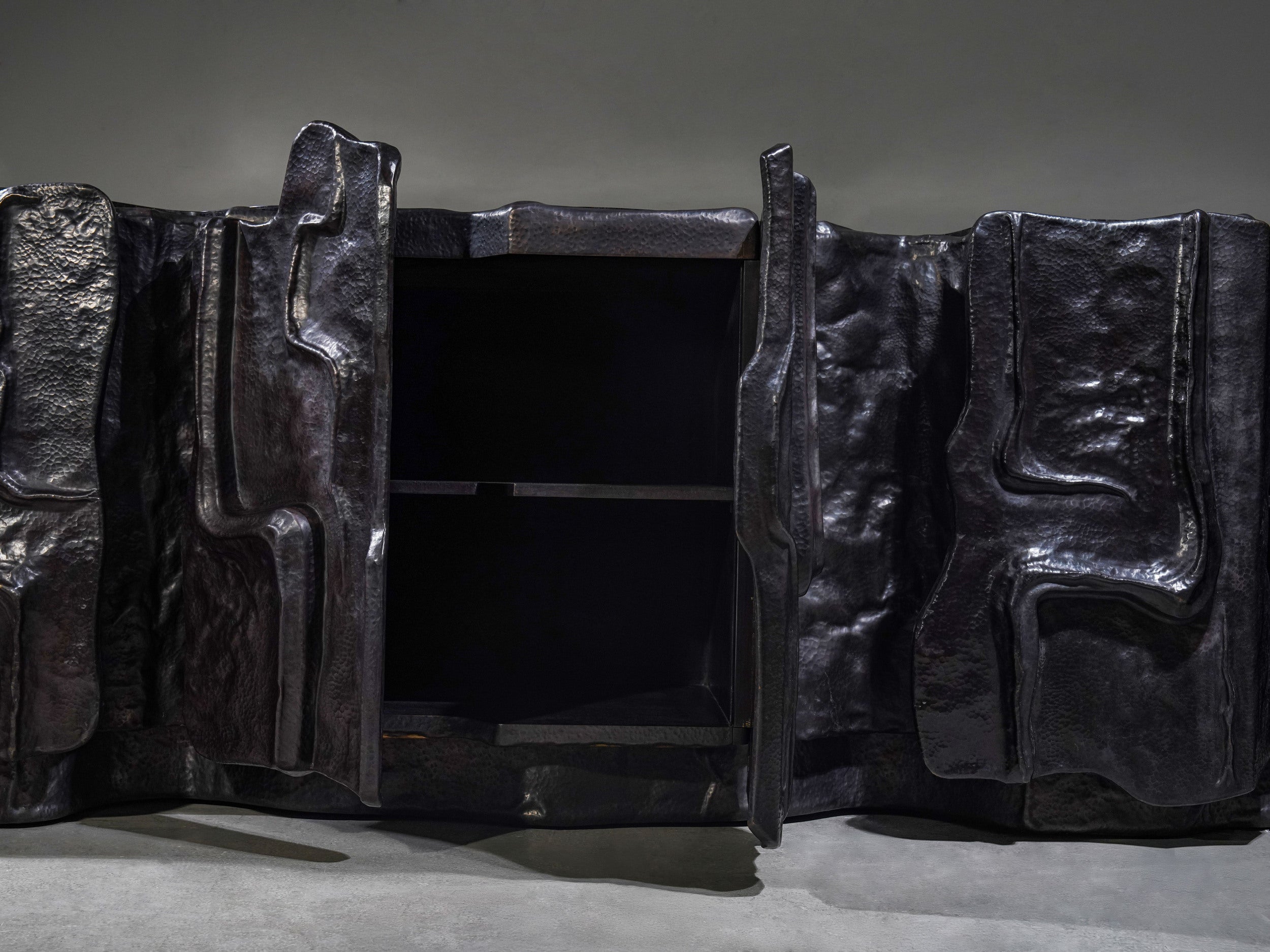 The Mesa Cabinet recalls a landscape shaped by time, wind, and erosion. It finds its rhythm in the rise and fall, formed through the repoussé technique — where sheets of metal are pressed and hand-hammered from the reverse to build grand elevations. In bronze finished brass, it captures the drama of shifting terrain; its cavernous recesses and layered contours resemble the natural erosion that is grounded and monumental.