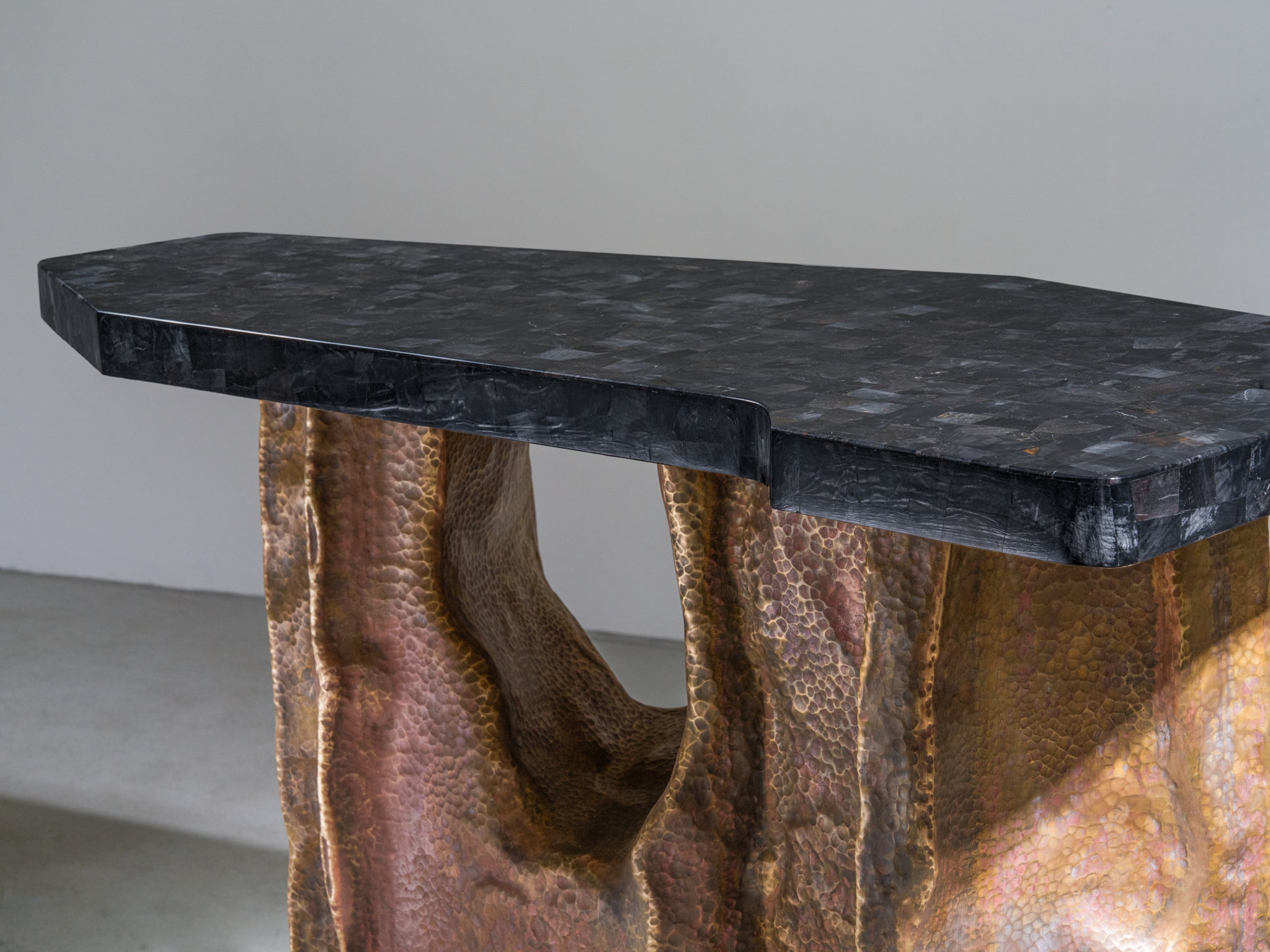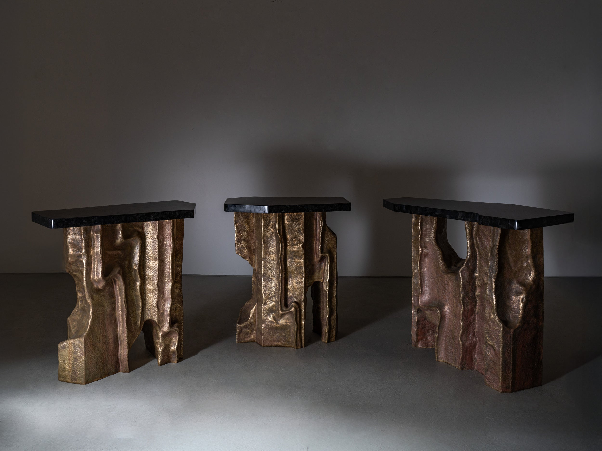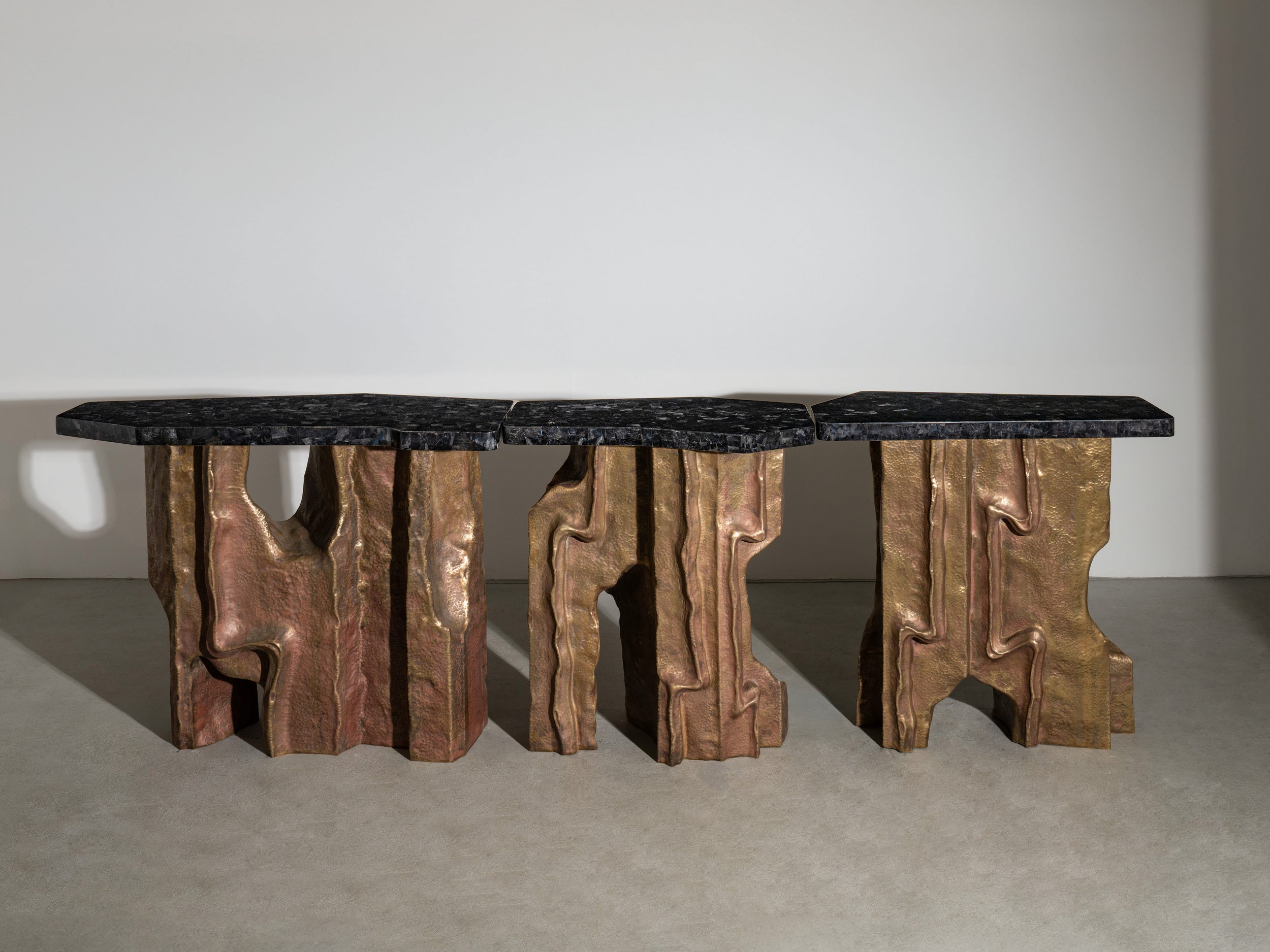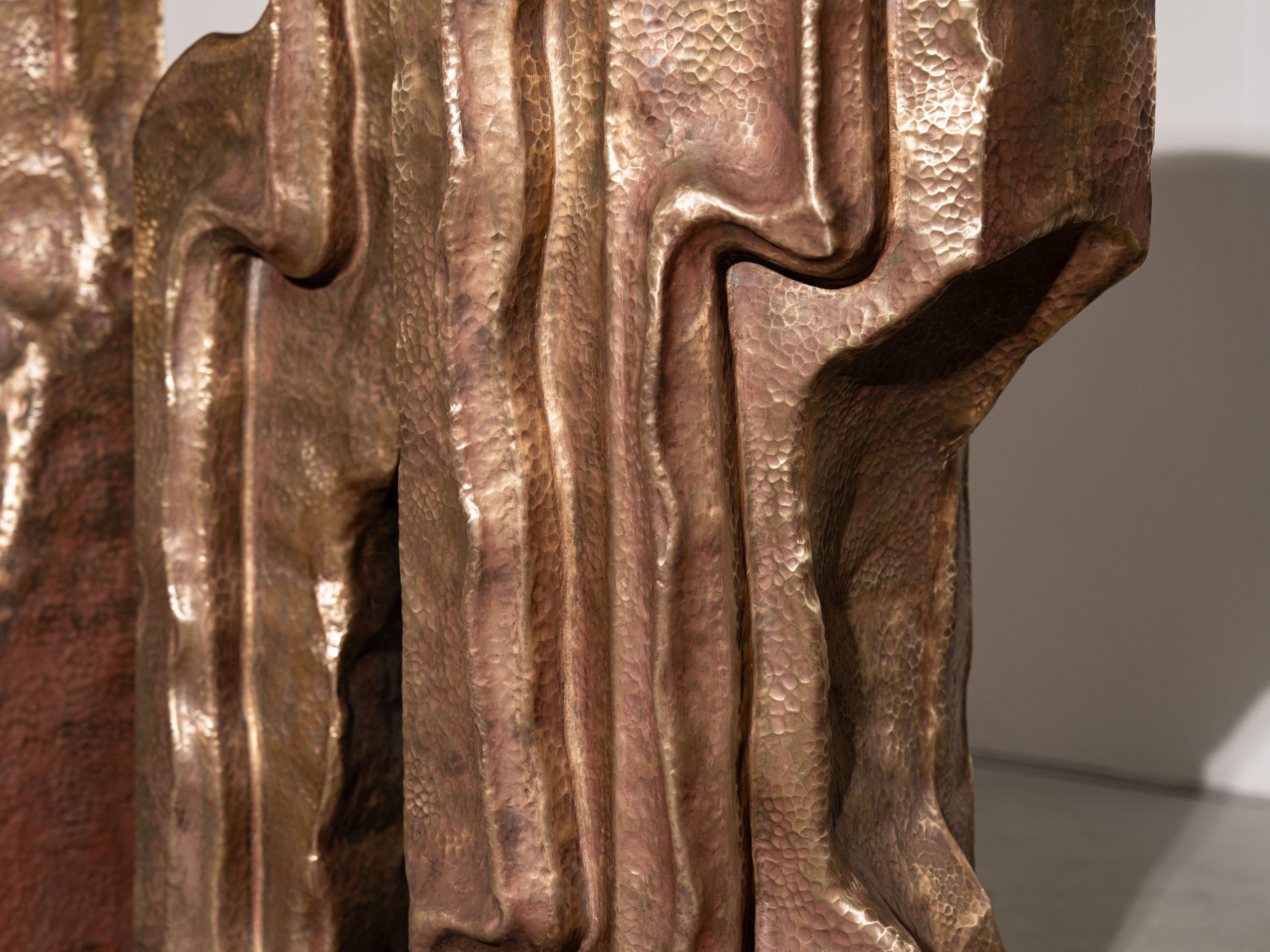 Mesa recalls a landscape shaped by time, wind, and erosion. It finds its rhythm in the rise and fall, formed through the repoussé technique—where sheets of metal are pressed and hand-hammered from the reverse to build grand elevations. In patinated brass, it captures the drama of shifting terrain; its cavernous recesses and layered contours resemble the natural erosion, that is grounded and monumental.