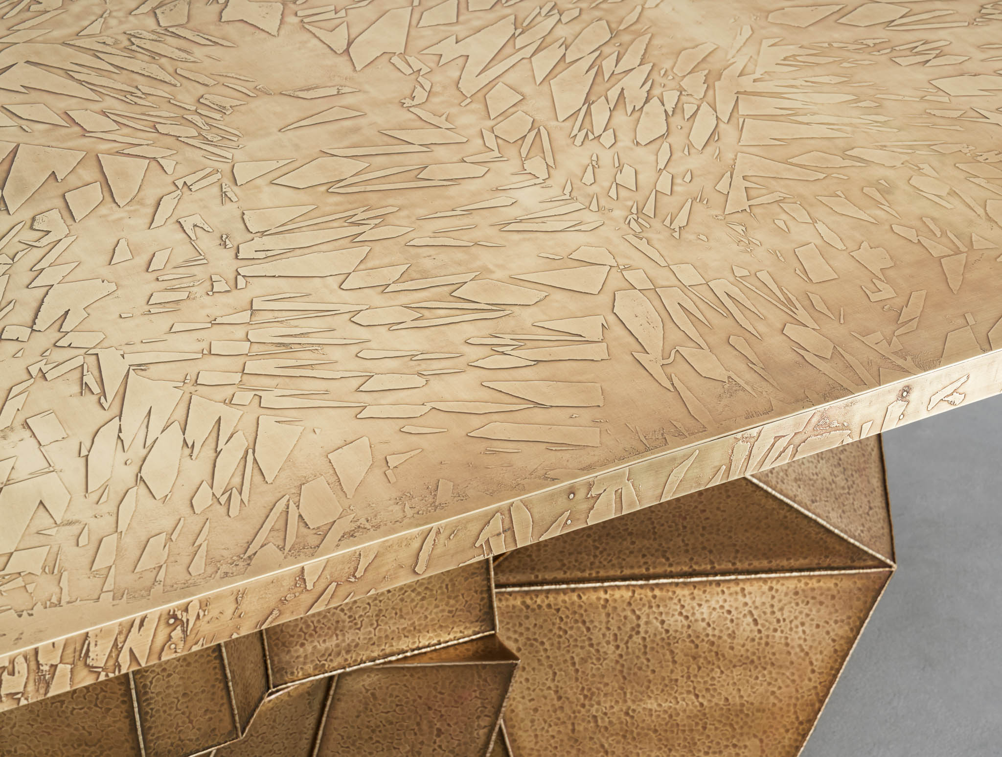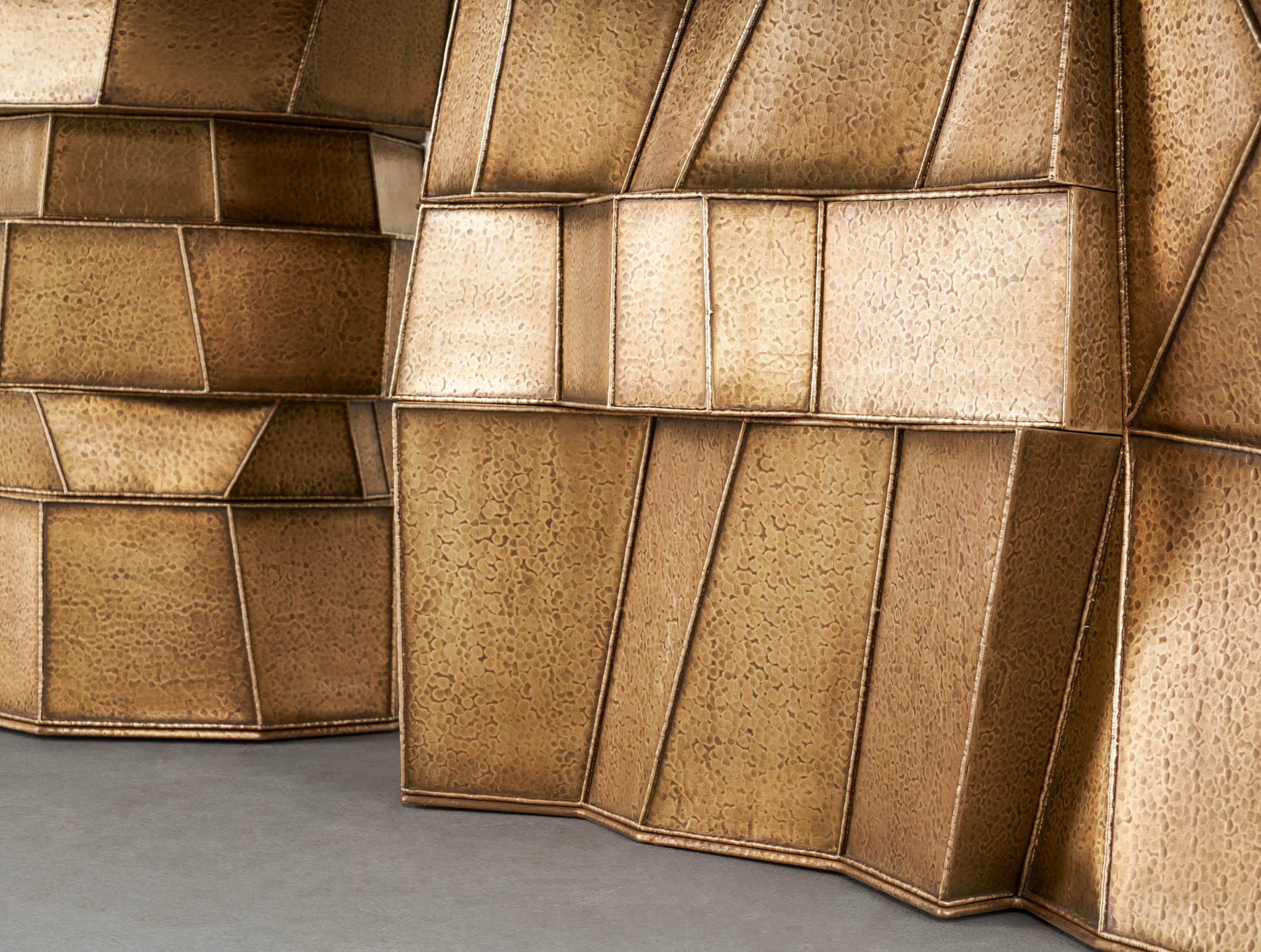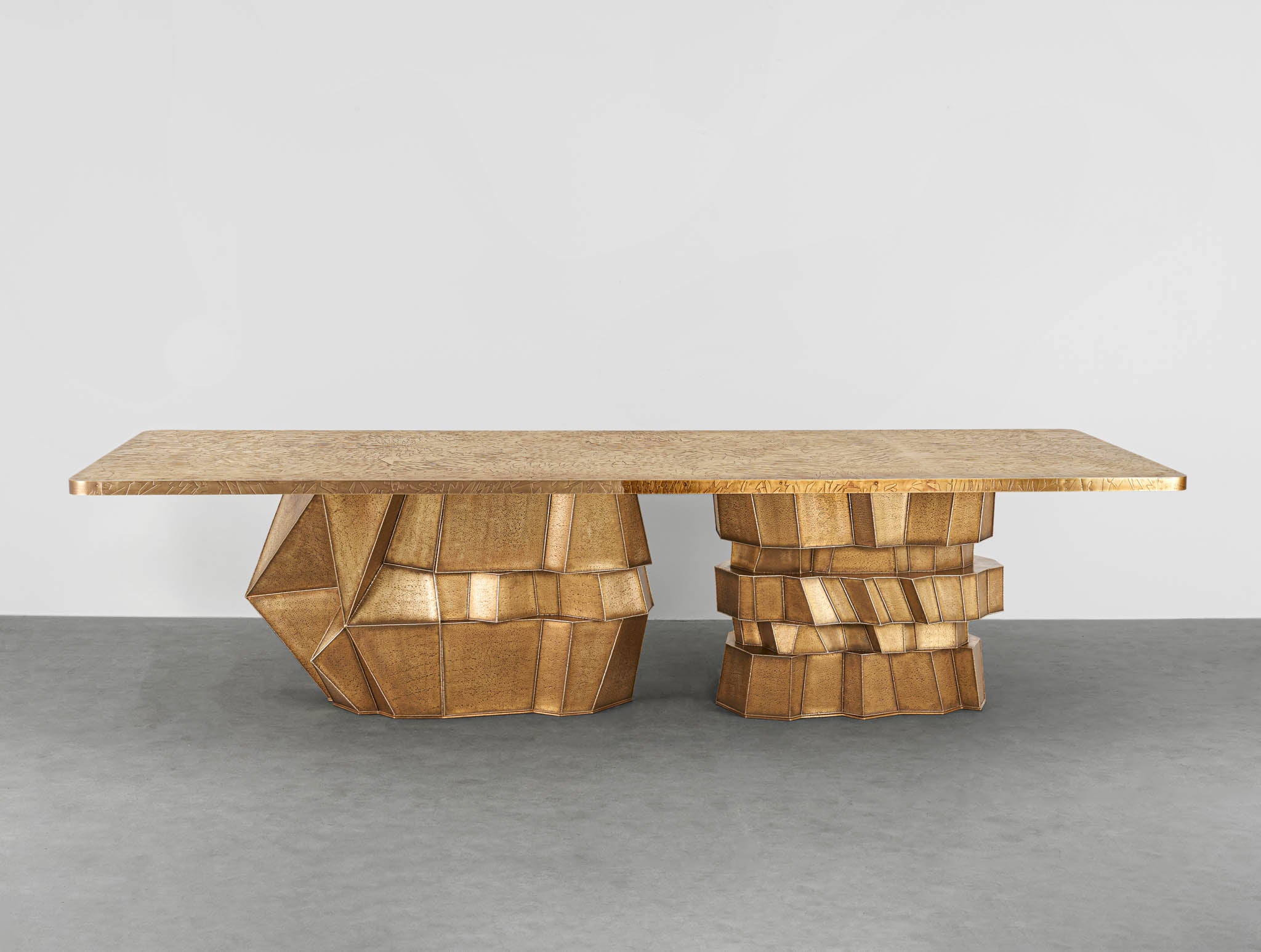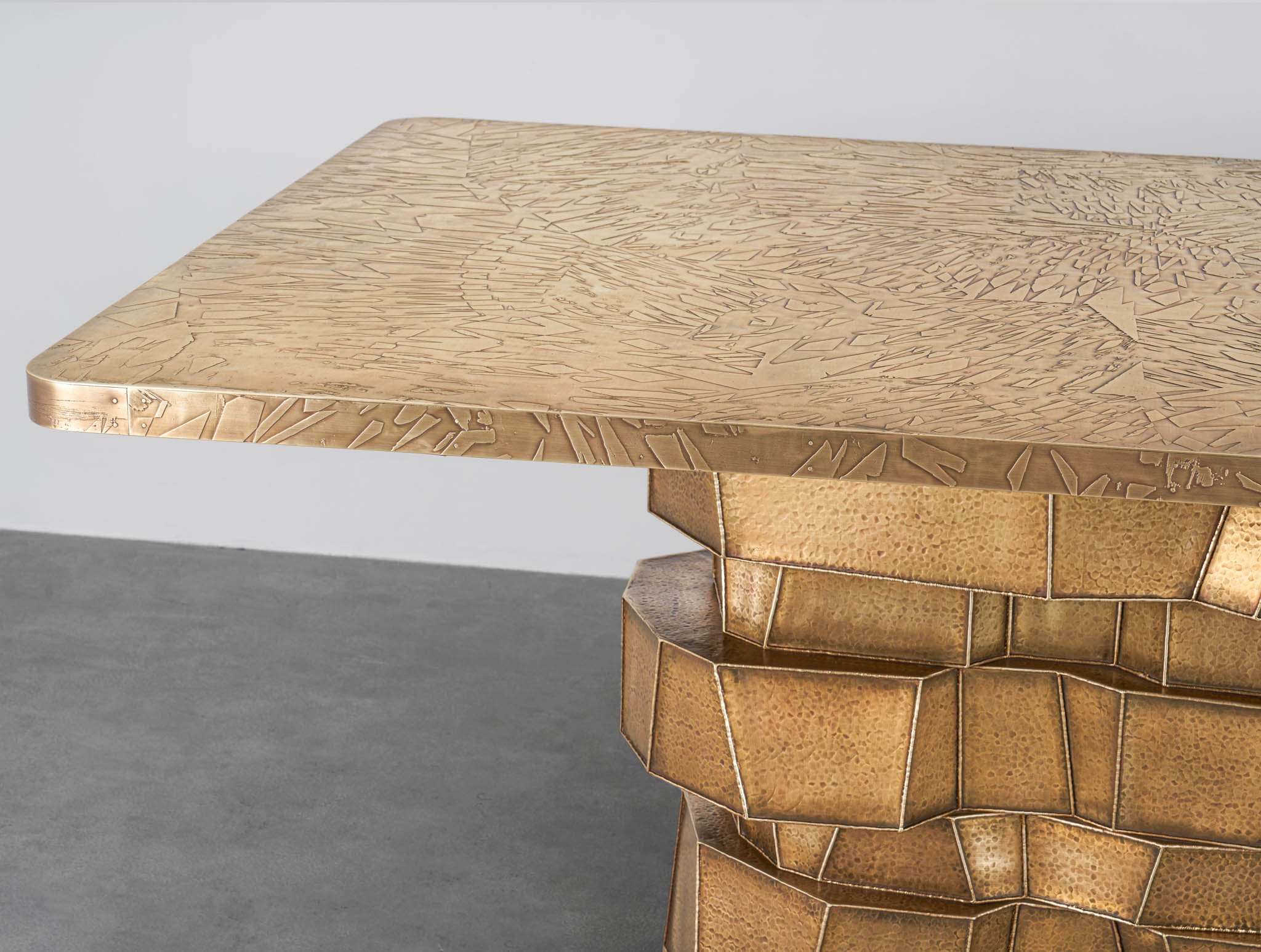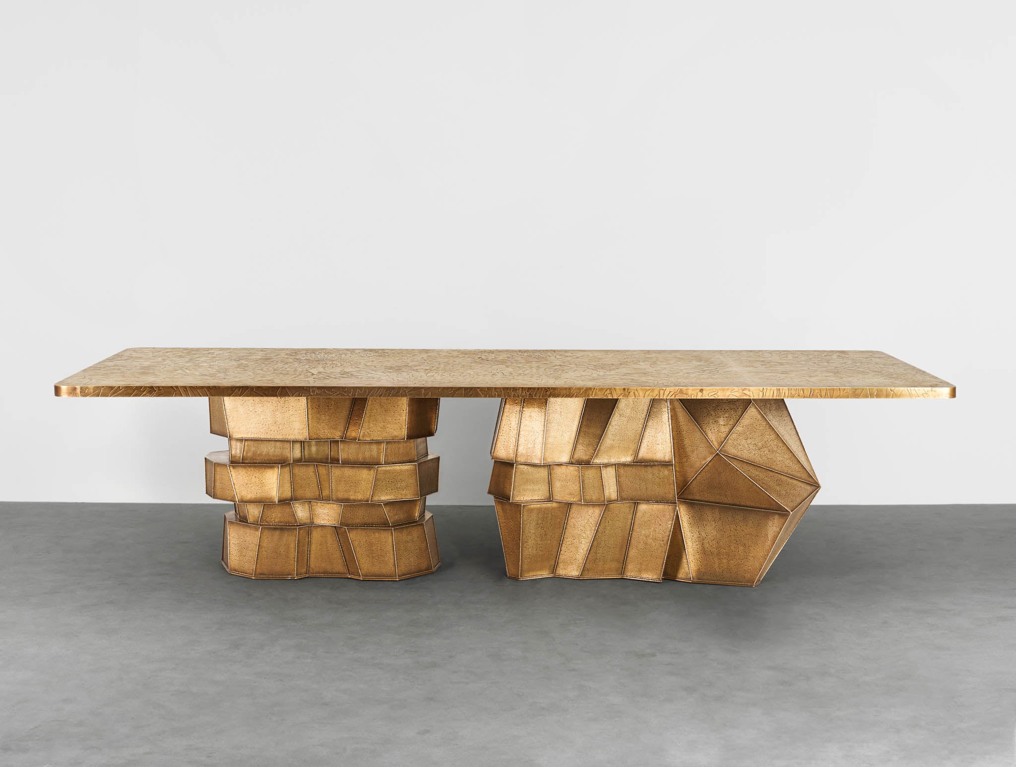 A striking exemplar of the studios’ trademark technique ‘Hollowed Joinery’, this dining table is a marriage of materials with hammered brass sheets welded together to create a beautiful hollowness within. The patinated gold finish and asymmetrical structure is evocative of its process; individual yet enmeshed, a seamlessly intertwining of contrasting parts.