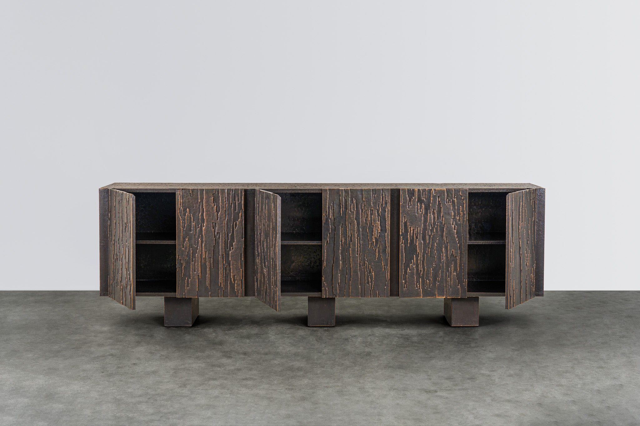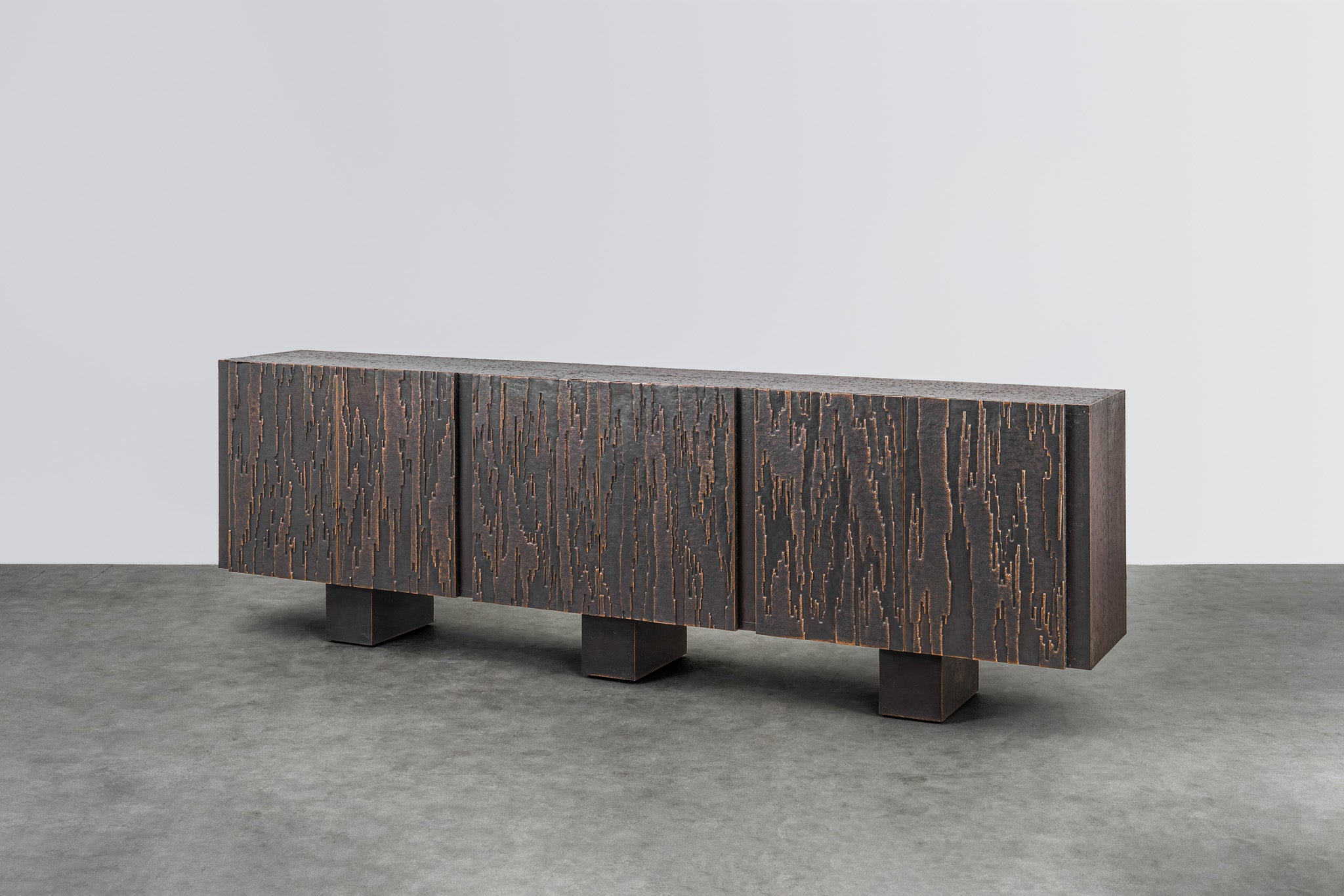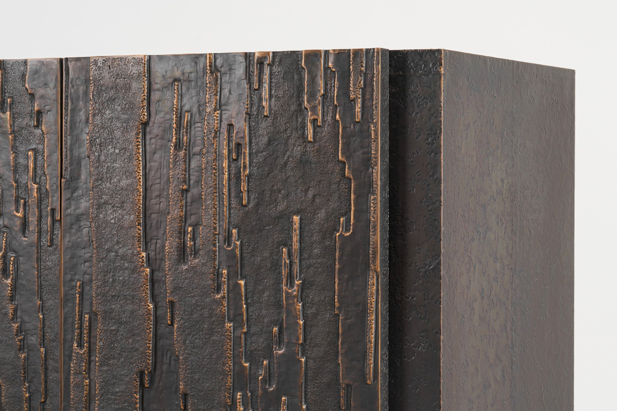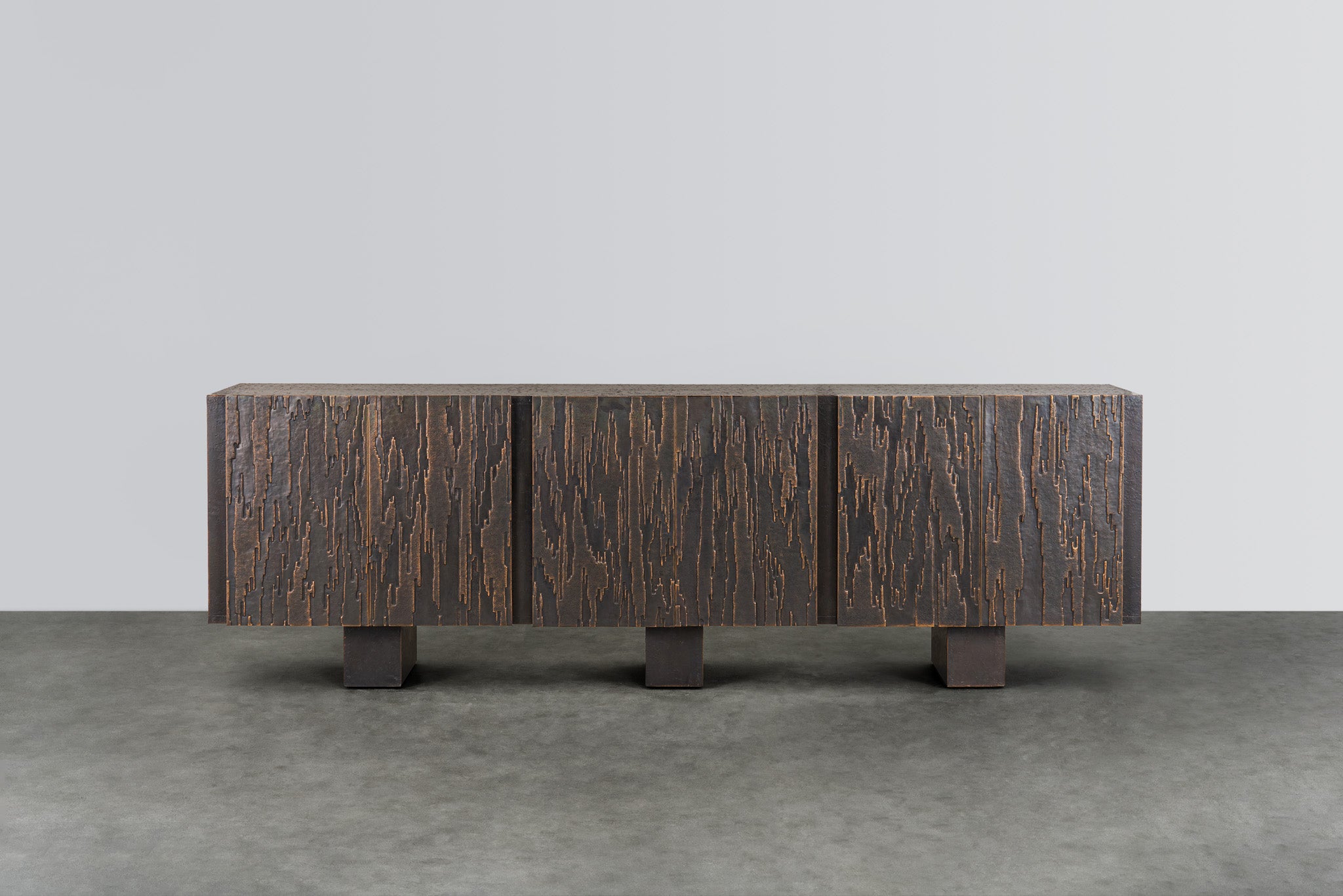 Inspired by the ancient city of Mohenjo-daro, this brass console has impressions of varying depth and form created by repoussé.