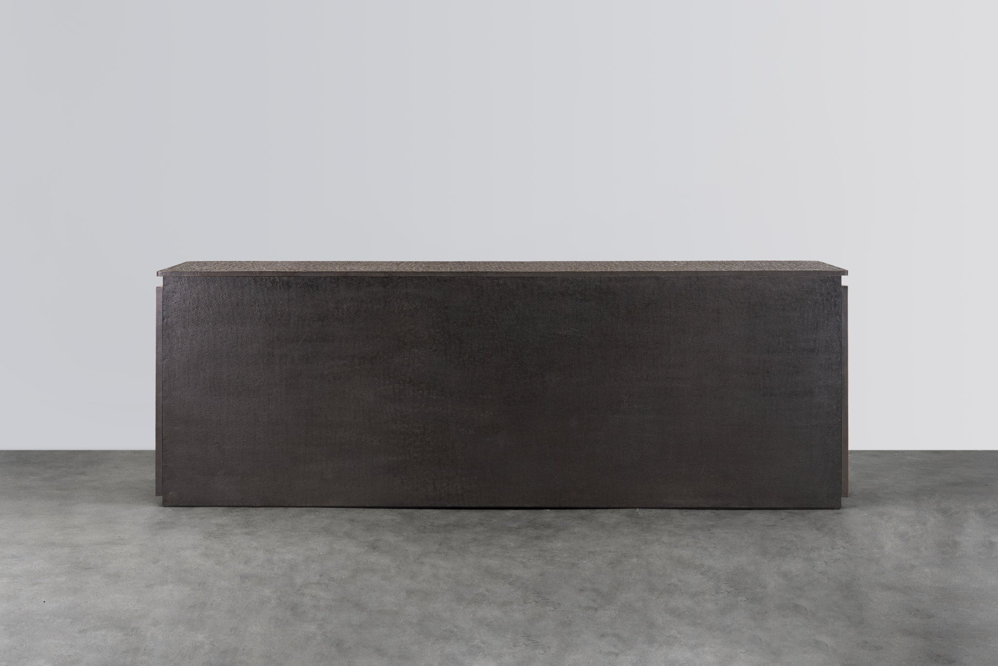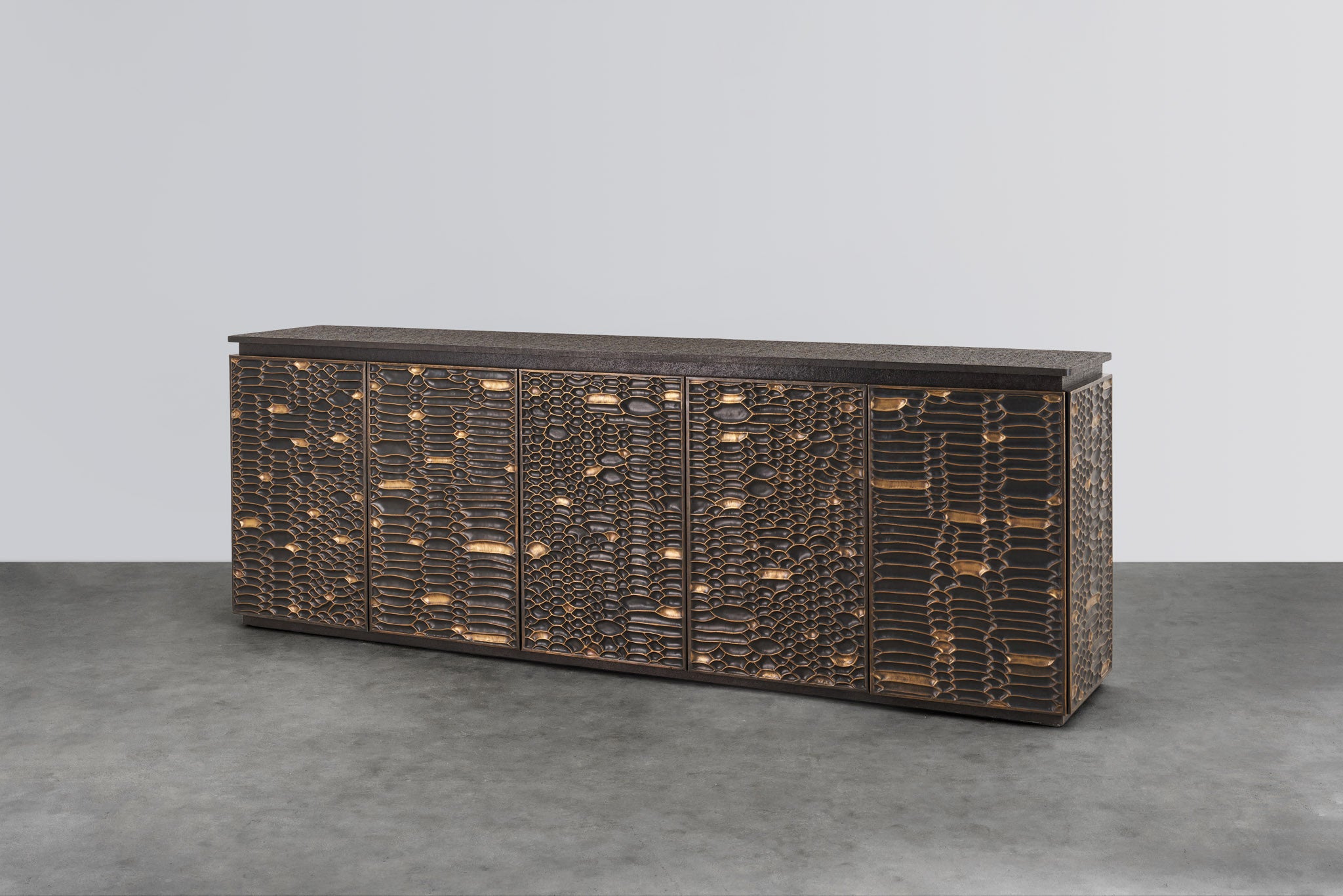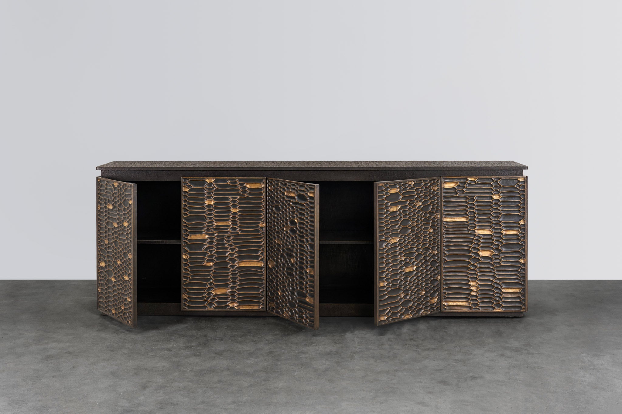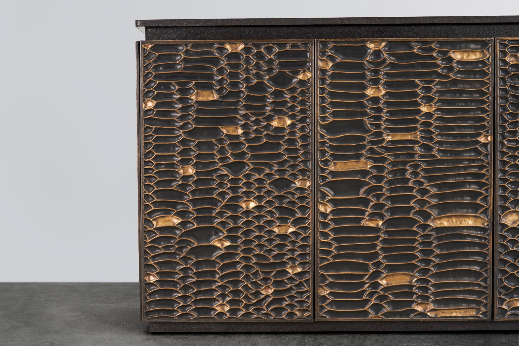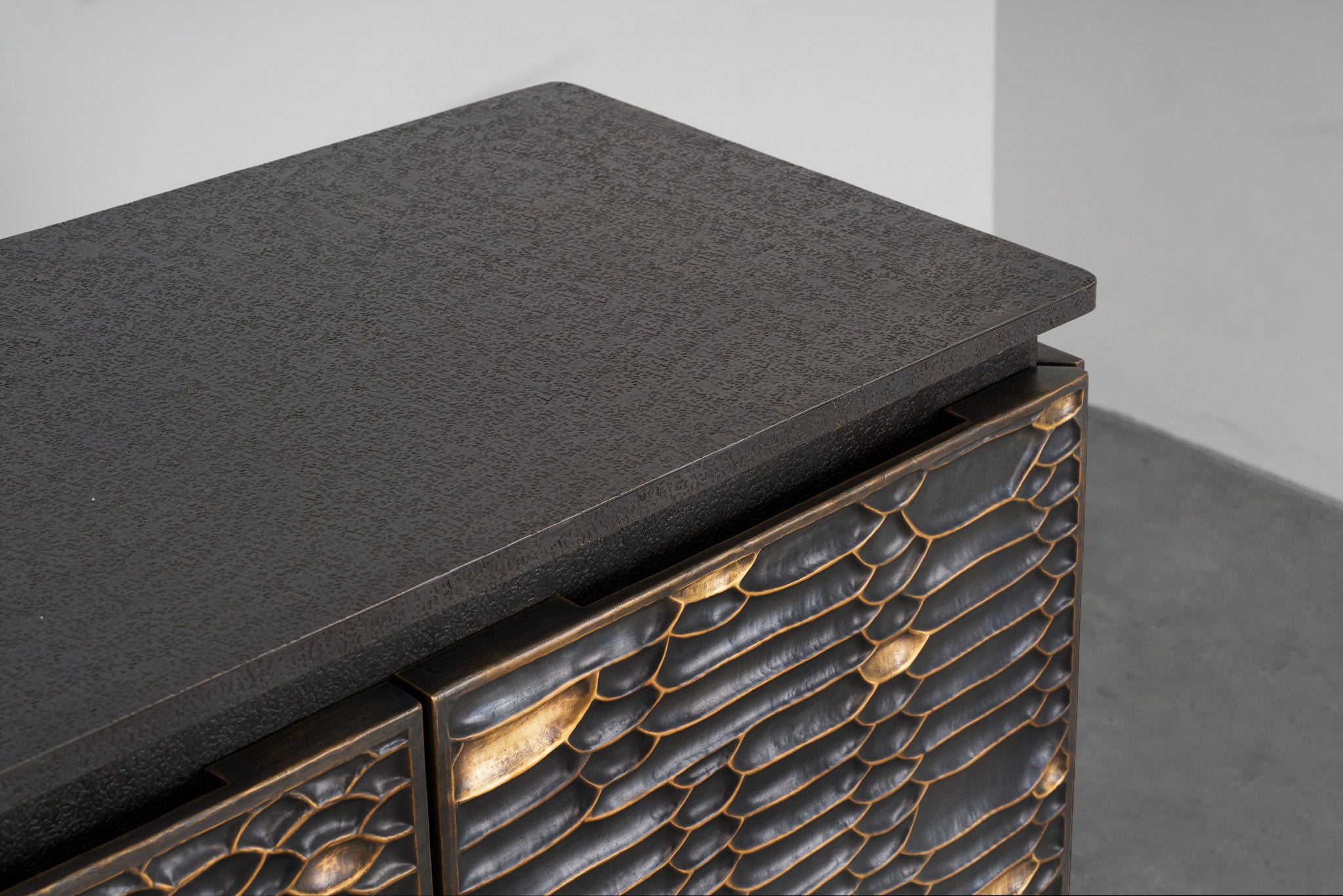 This light bronze cabinet highlights complex patterns of textured scale, with dappled patterns reminiscent of snakeskin across its facade. Each detail is created by the studio’s signature use of repoussage, the laborious and highly skilled process of hammering low-relief designs into malleable metal sheets from the reverse. Available outside India, exclusively at Nilufar Gallery, Milan.