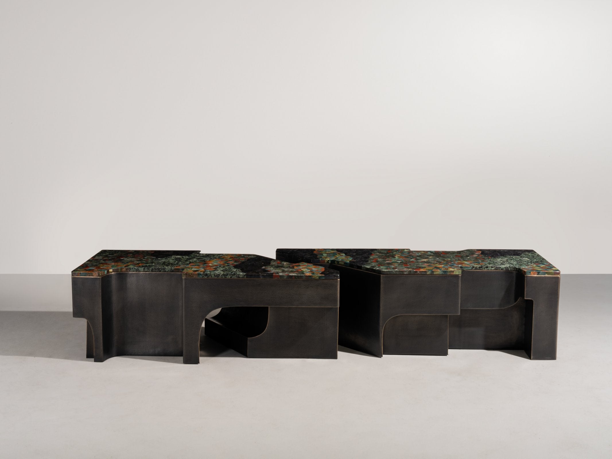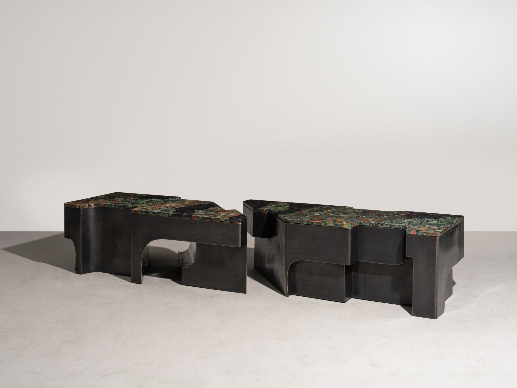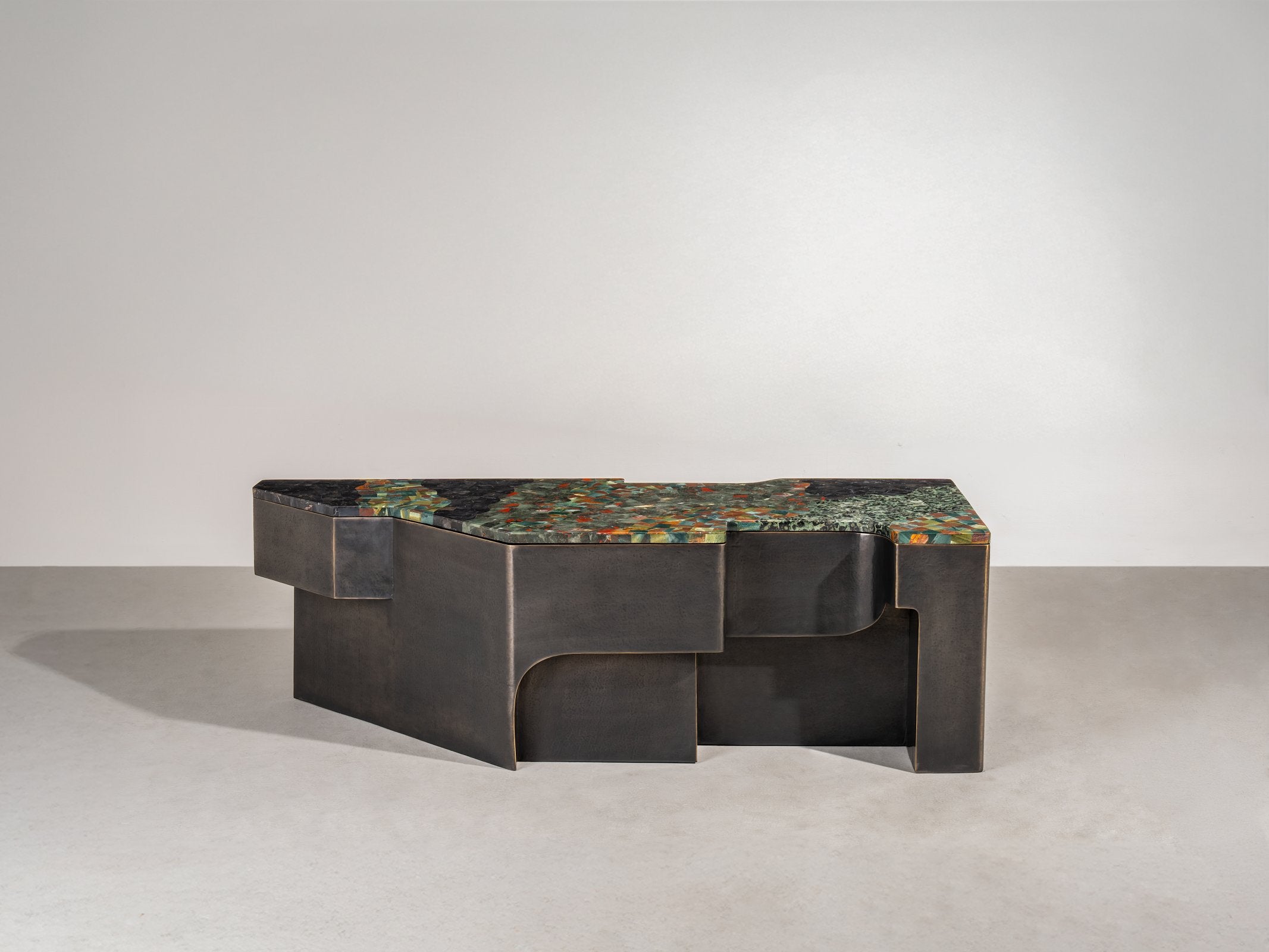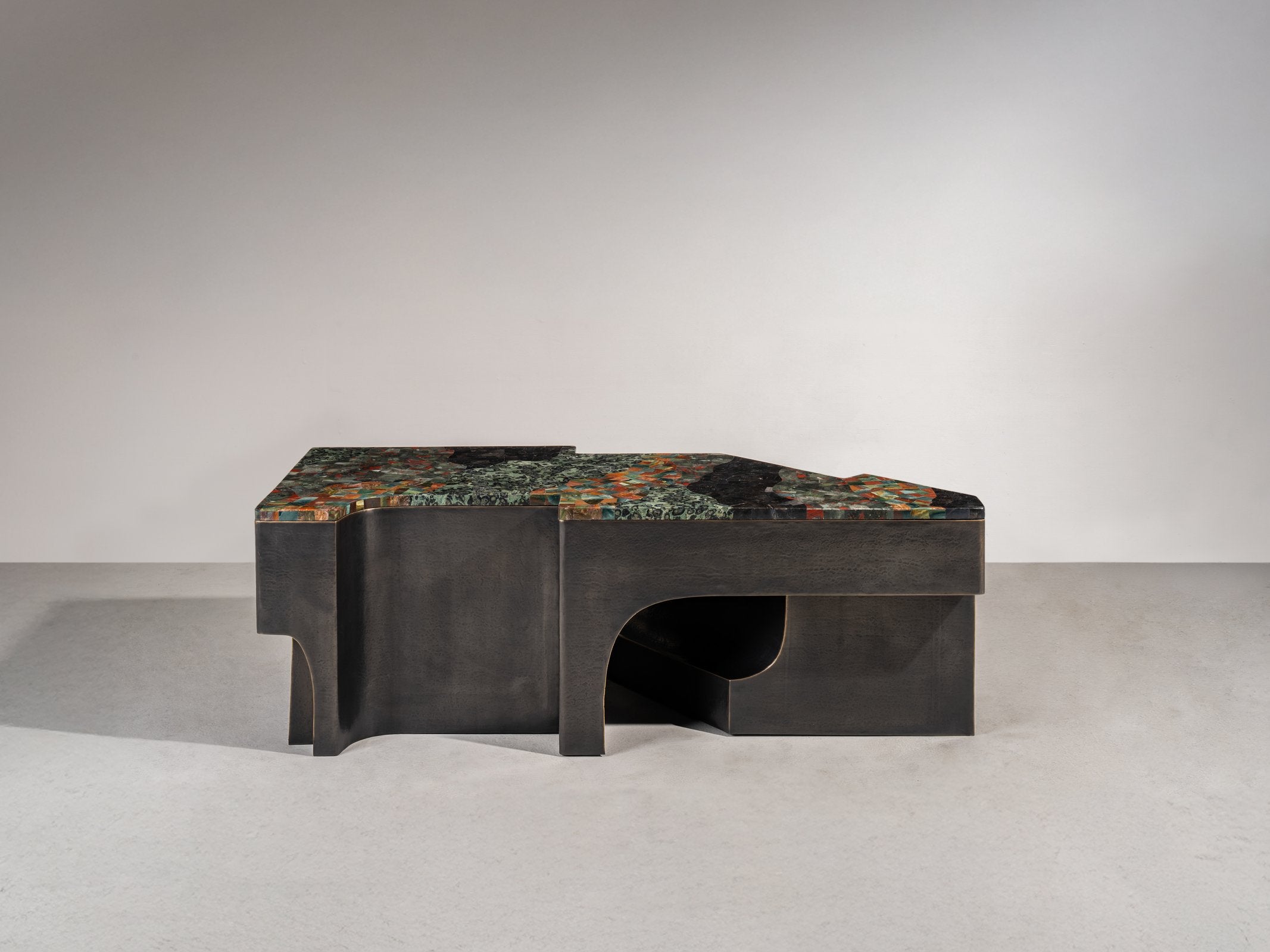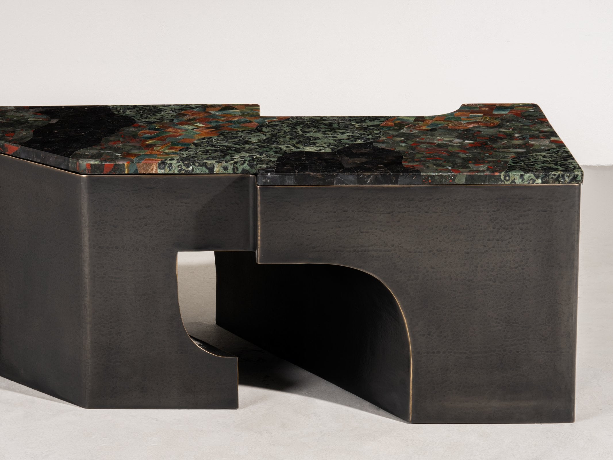 Inspired by the architectural language of the Italian Renaissance, this monumental console is crafted in nickel and bronze brass. Its sweeping curves— shaped from hand-hammered metal sheets—are seamlessly welded using the studio’s complex hollowed joinery technique. The result of technical mastery, the piece balances the rigour of structural integrity with sculptural fluidity and the raw tactility of hammered metal.