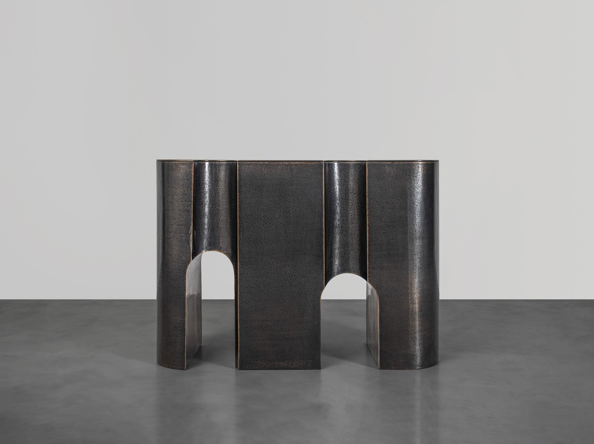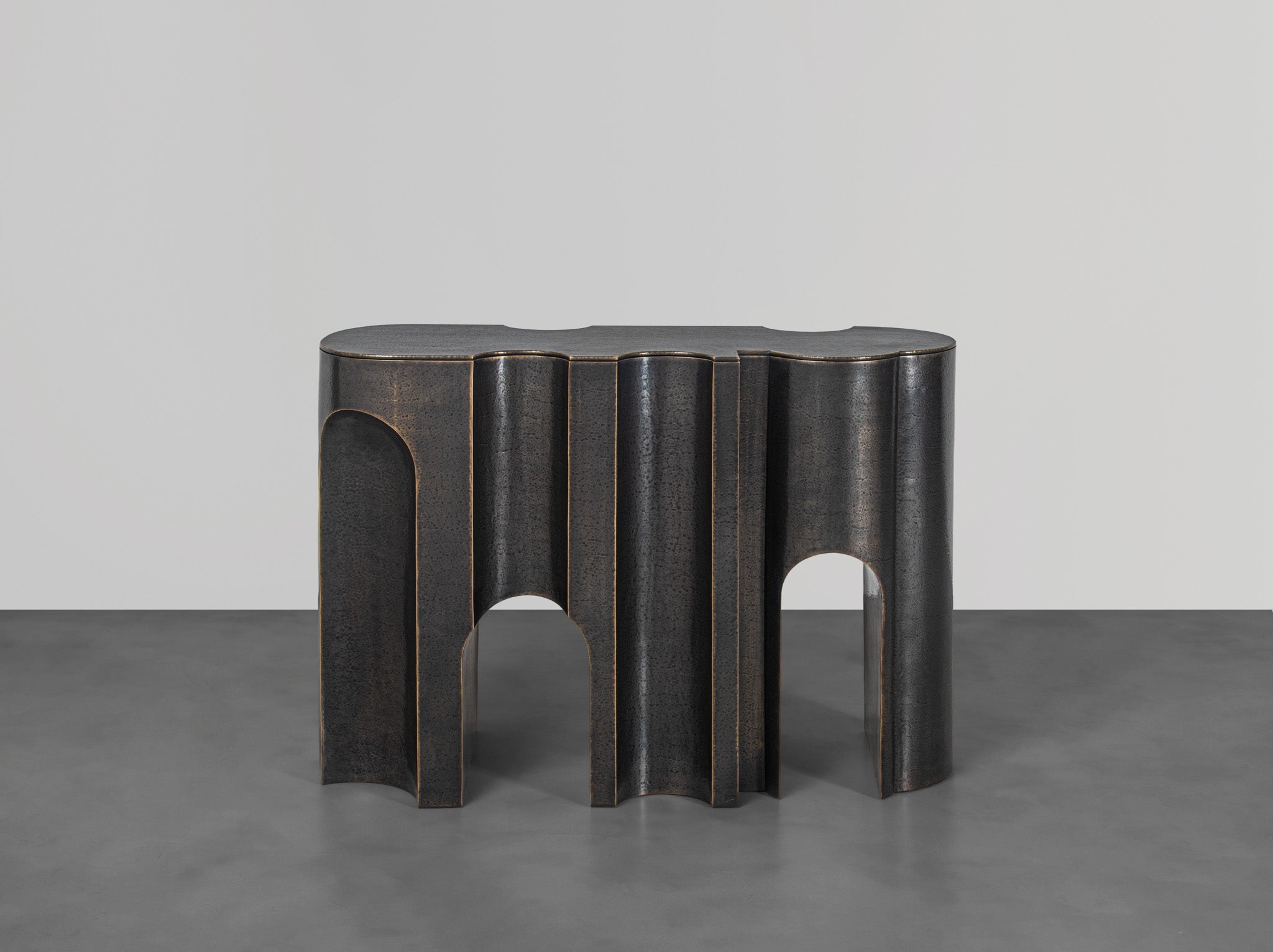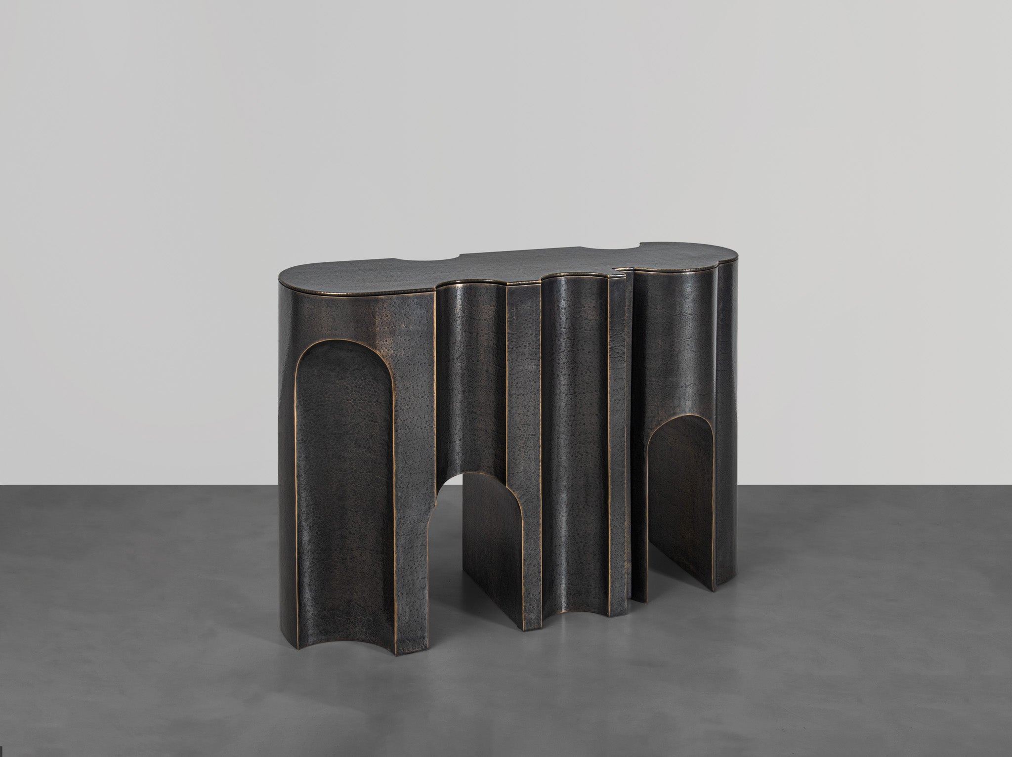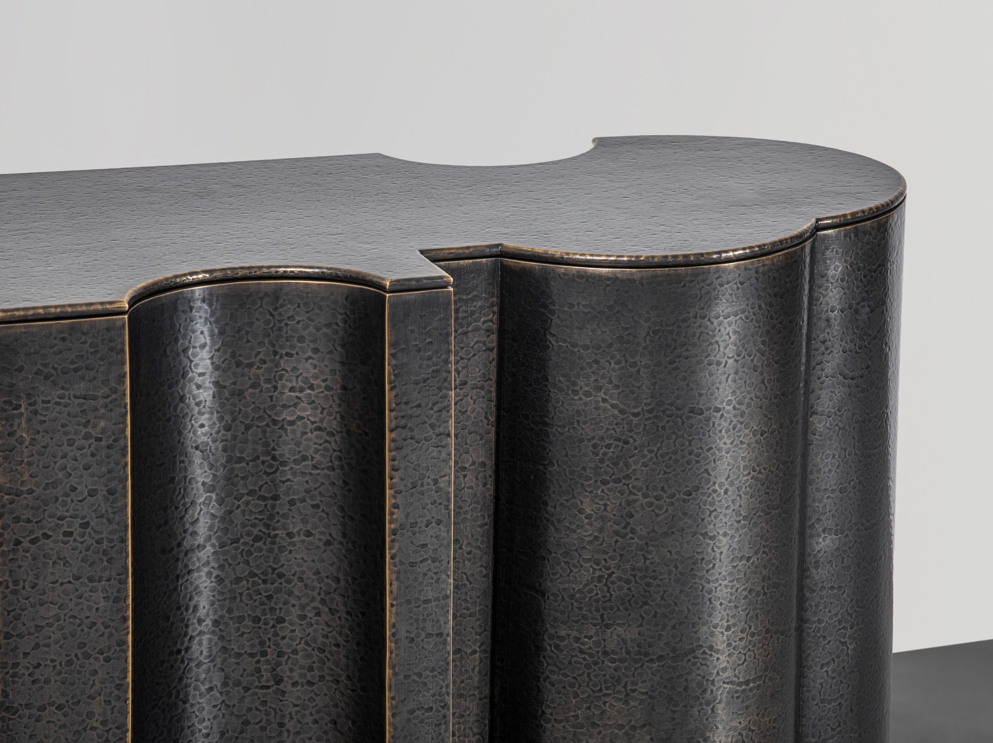 Inspired by the architectural language of the Italian Renaissance, this monumental console is crafted in nickel and bronze brass. Its sweeping curves— shaped from hand-hammered metal sheets—are seamlessly welded using the studio’s complex hollowed joinery technique. The result of technical mastery, the piece balances the rigour of structural integrity with sculptural fluidity and the raw tactility of hammered metal.