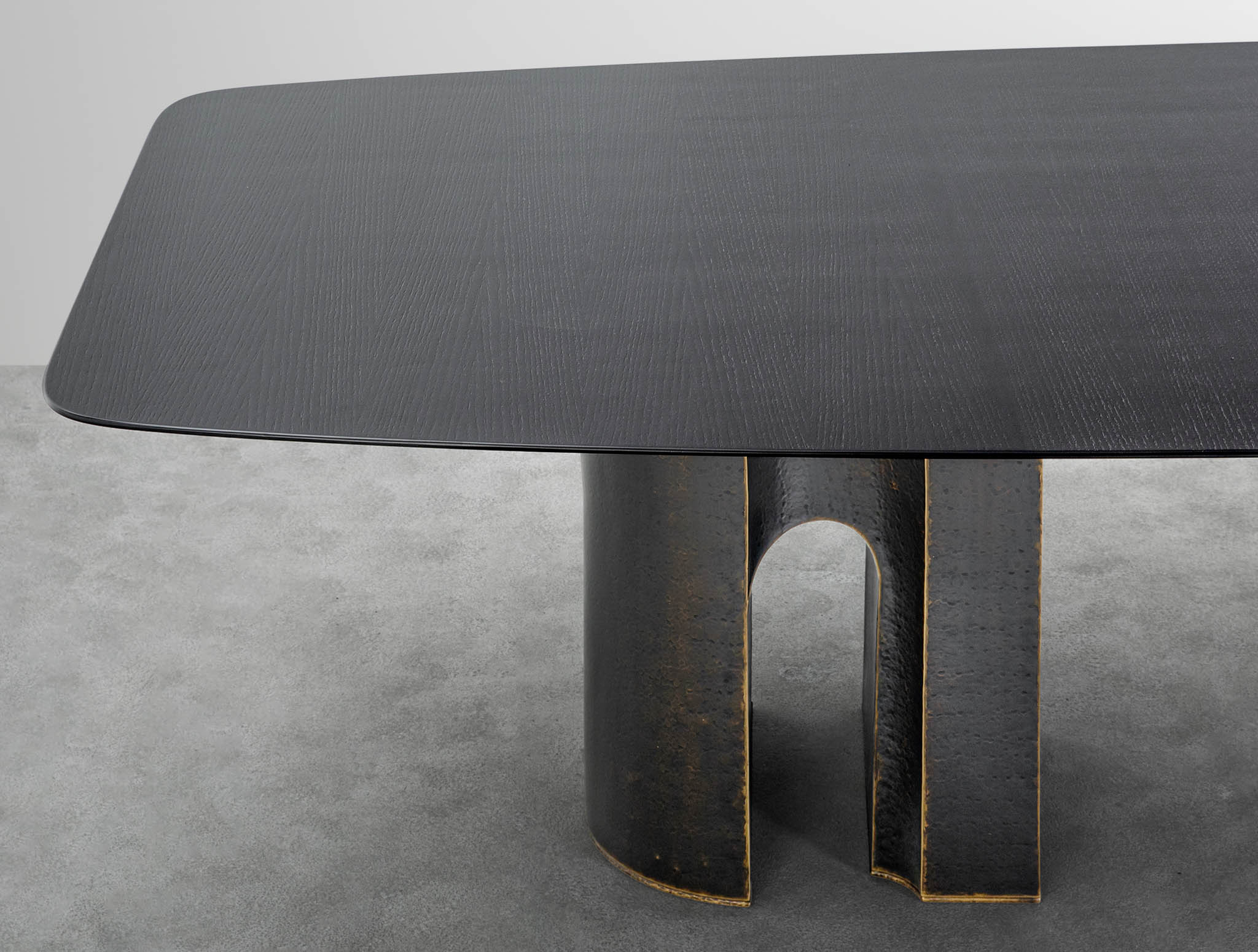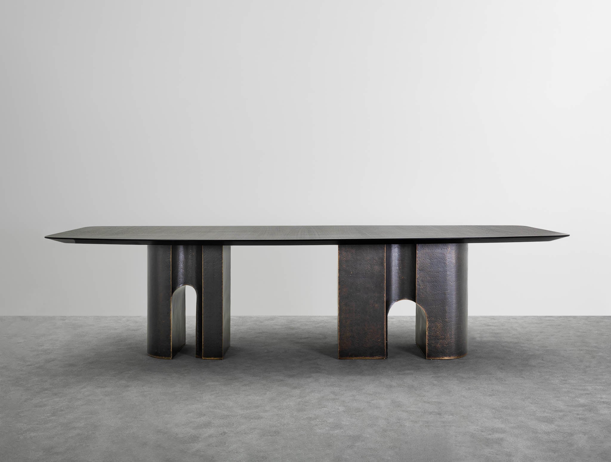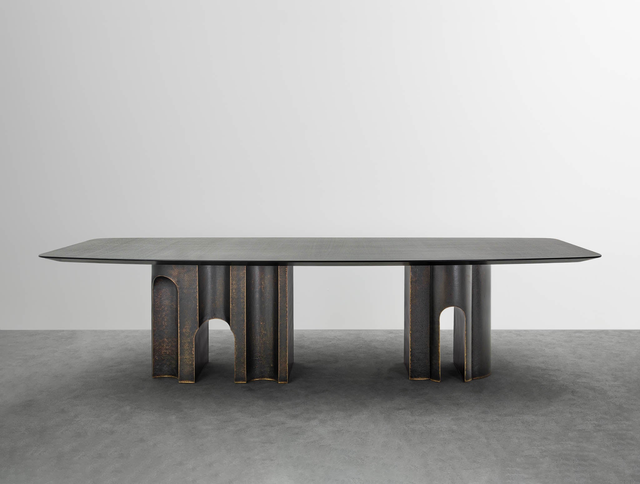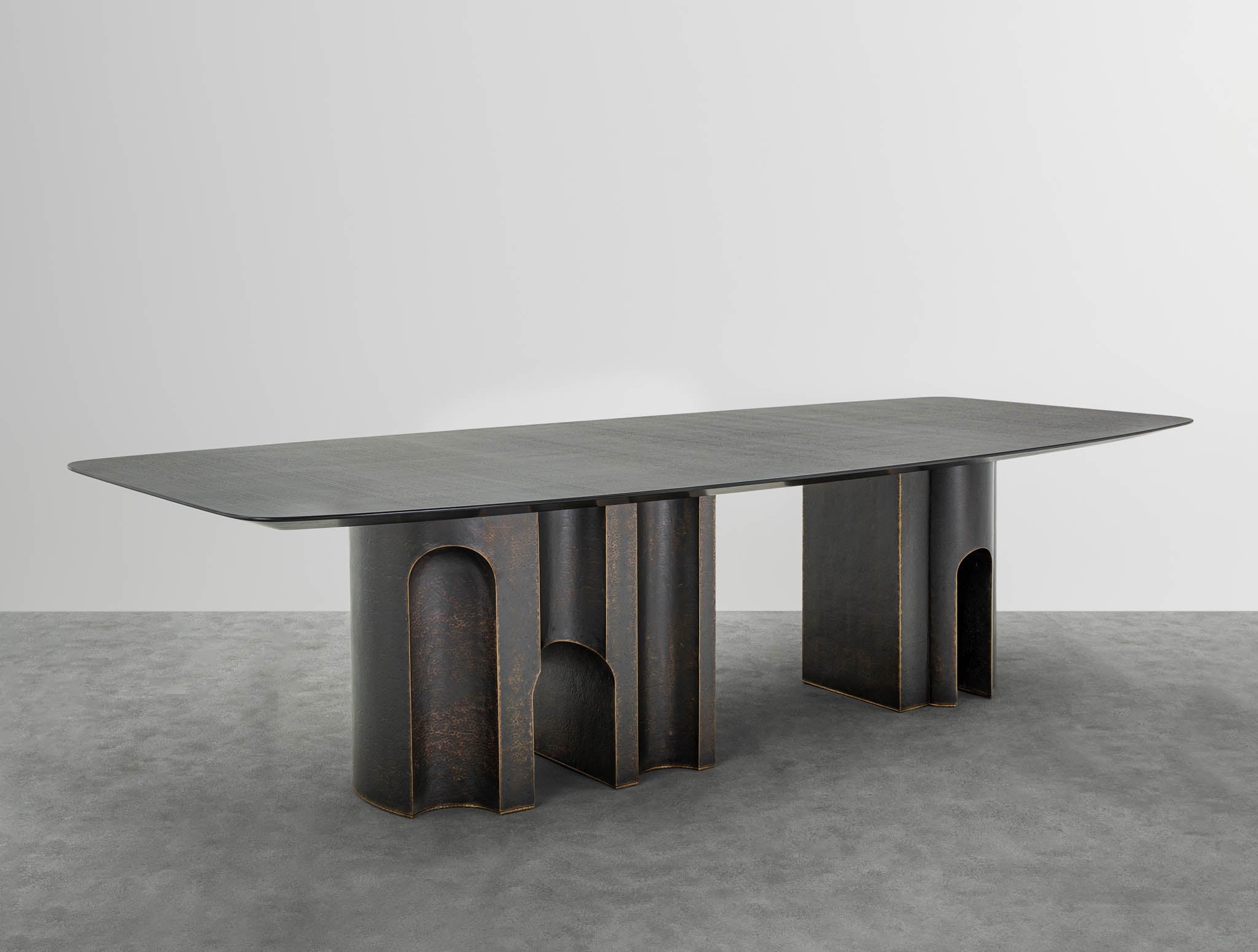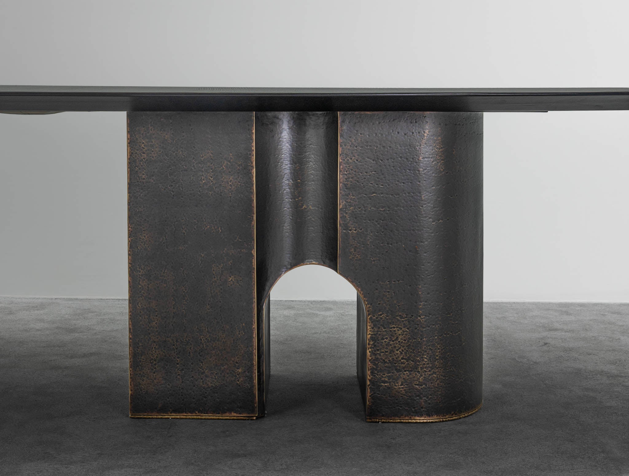 Inspired by the architectural language of the Italian Renaissance, this monumental console is crafted in nickel and bronze brass. Its sweeping curves— shaped from hand-hammered metal sheets—are seamlessly welded using the studio’s complex hollowed joinery technique. The result of technical mastery, the piece balances the rigour of structural integrity with sculptural fluidity and the raw tactility of hammered metal.