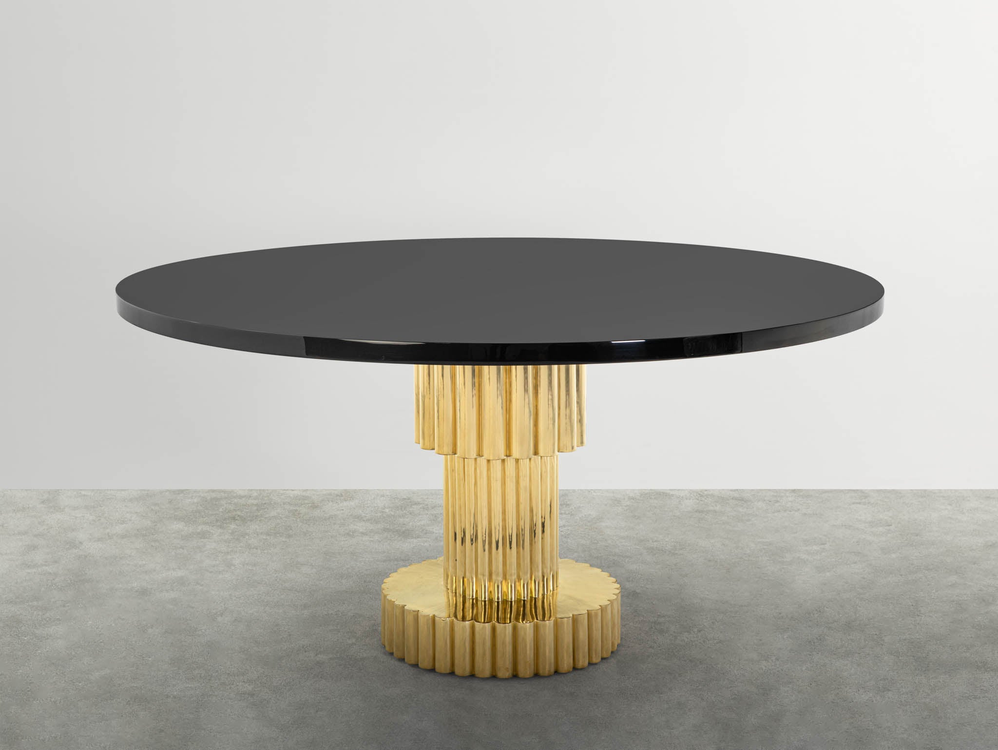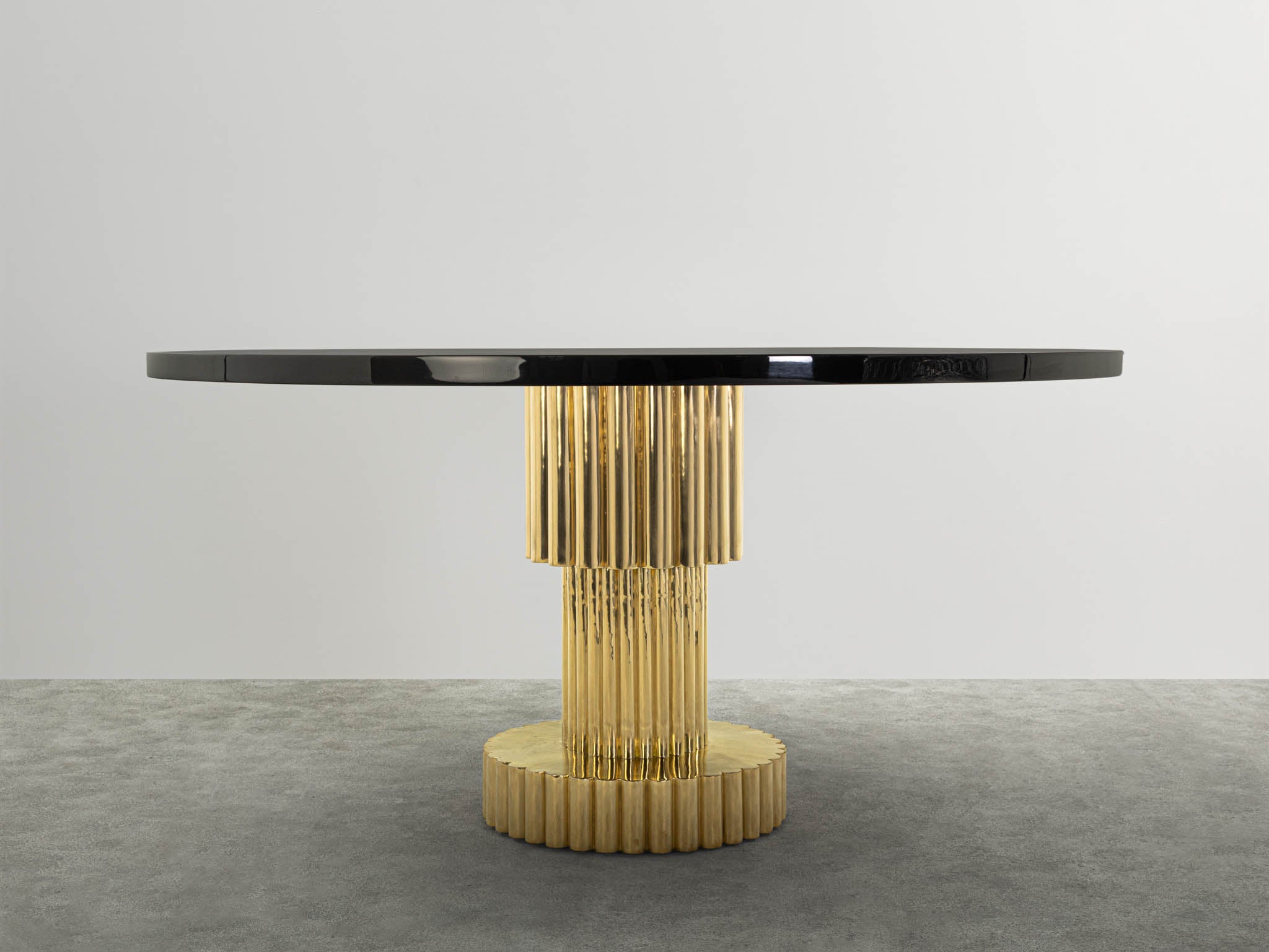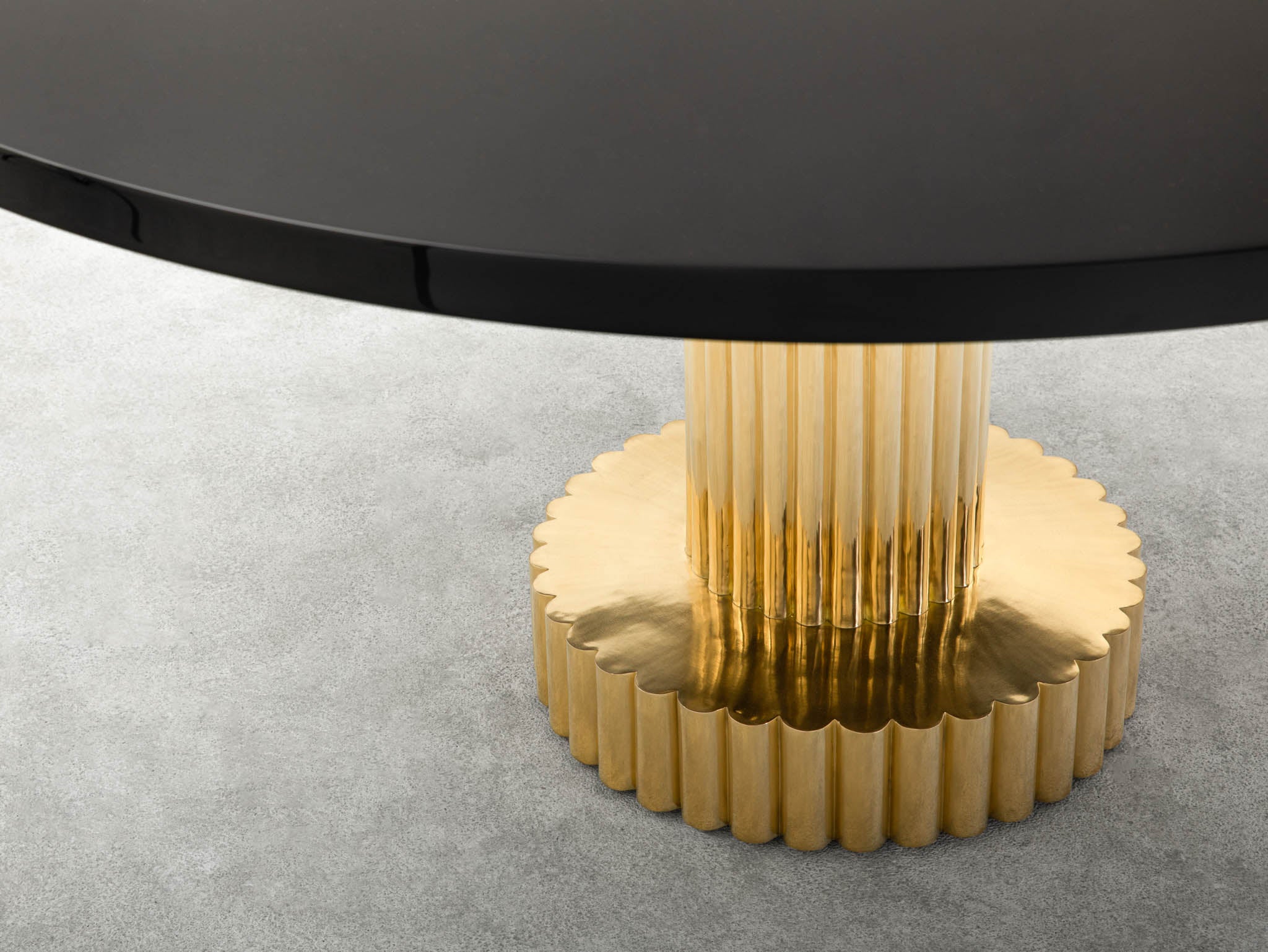 Pluto, our round table, with a distinctive base crafted using the fluting technique, where smooth metal sheets are scored with precise lines, creating a rhythmic undulation. A striking harmony emerges between the brilliance of the highly polished brass base and the sleek, glossy black stone top.