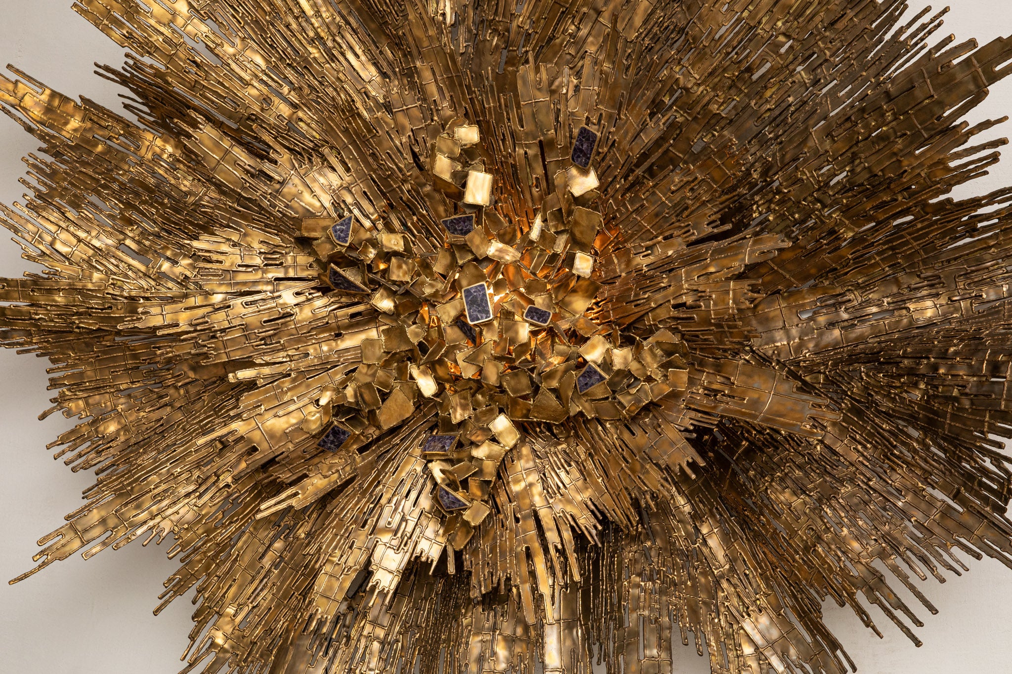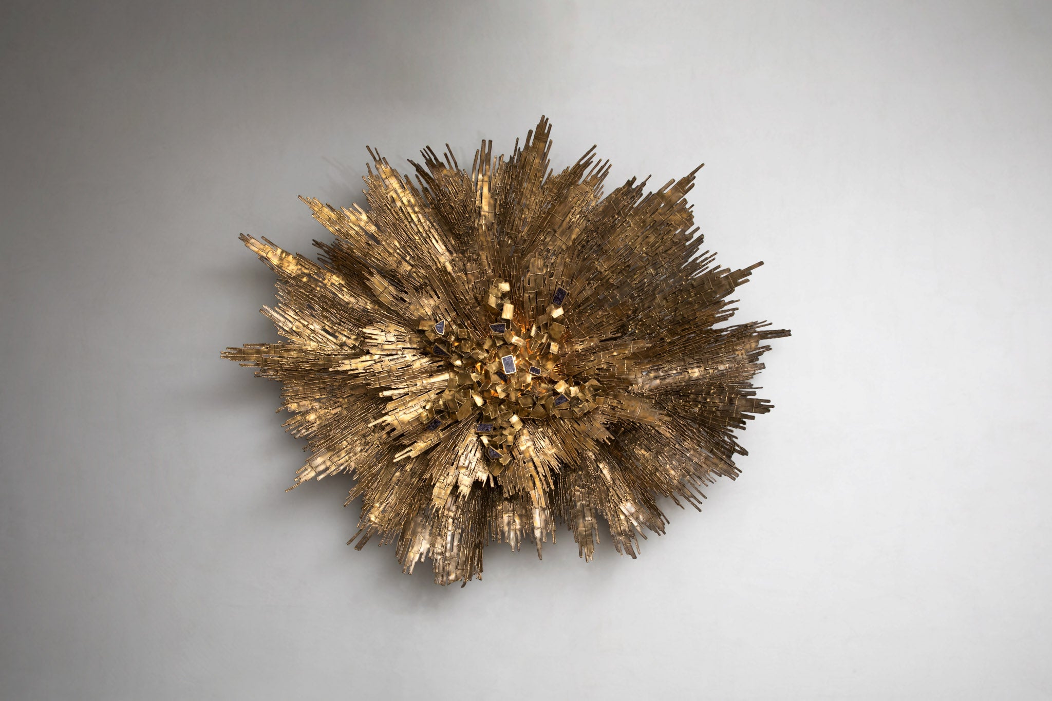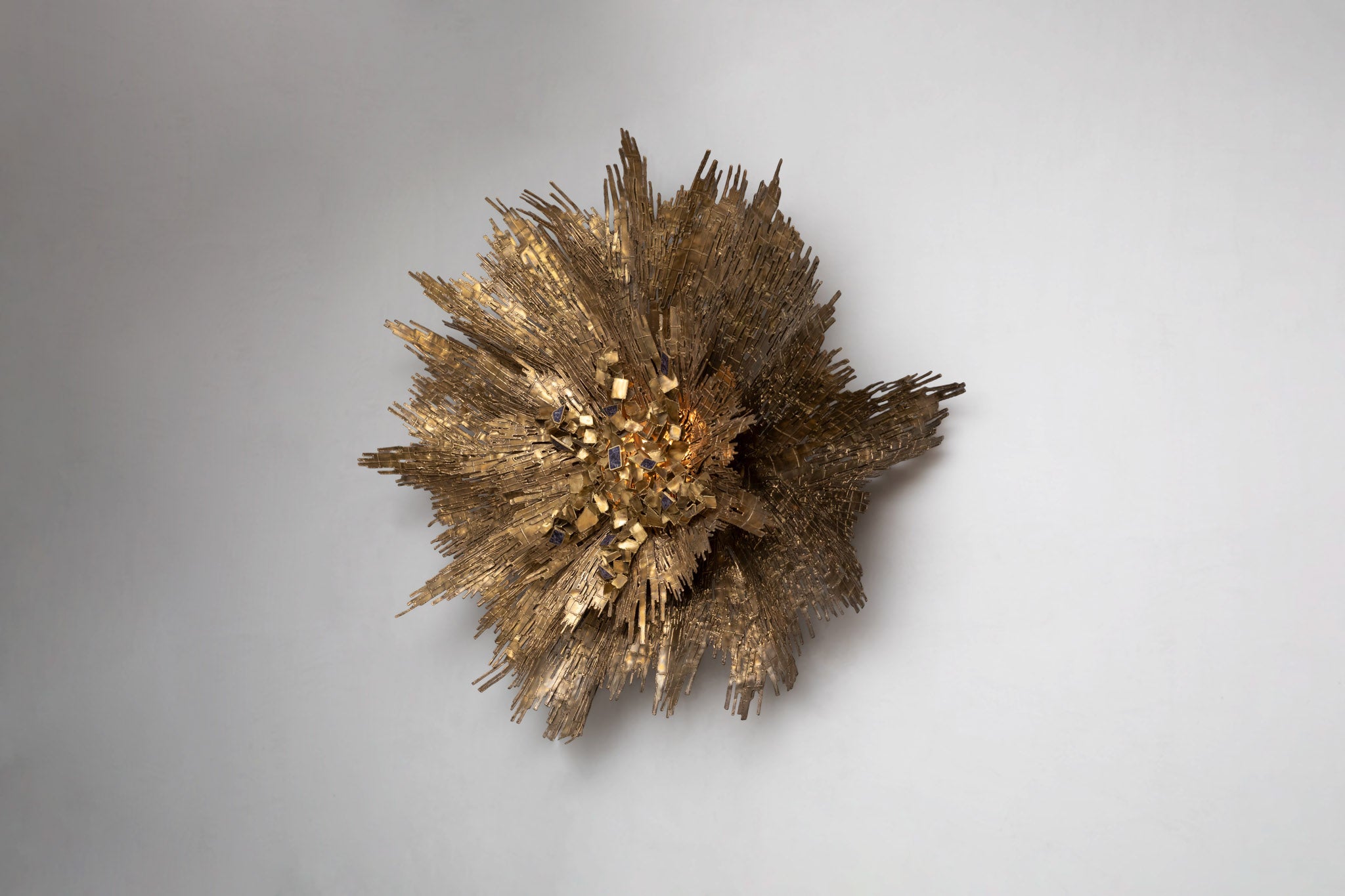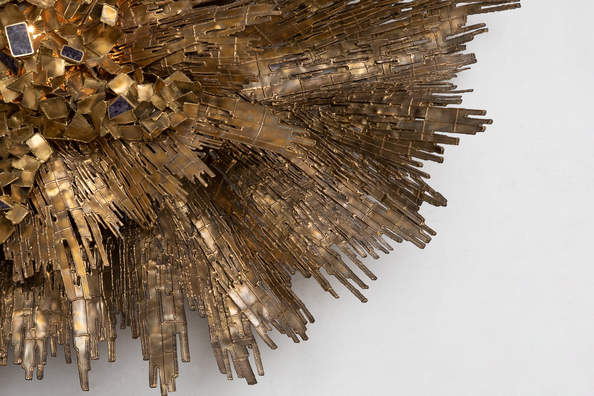 Radiating with the energy of Ra, the ancient Egyptian sun god, this sculptural wall light embodies the power of celestial brilliance. Cascading bursts of hand-cut brass shards emanate from a glowing core, evoking the sun’s rays piercing through the skies. Faceted gemstones, punctuate the golden explosion—a shining tribute to ancient mythology reimagined through contemporary craftsmanship.