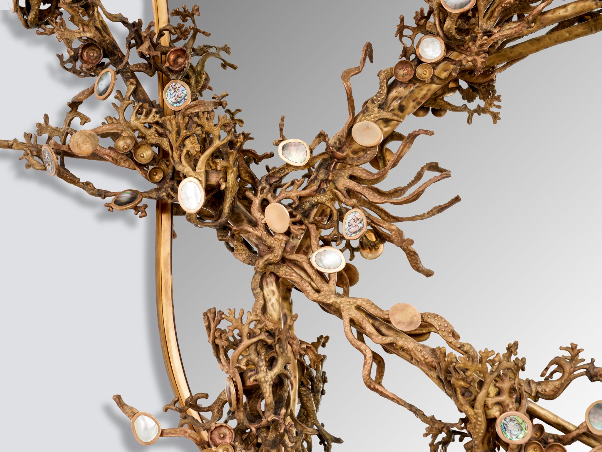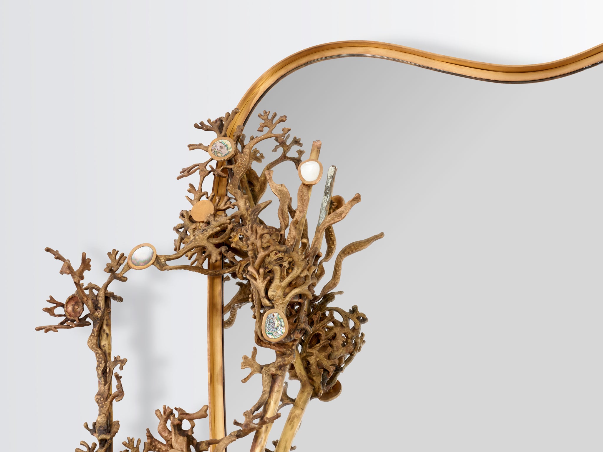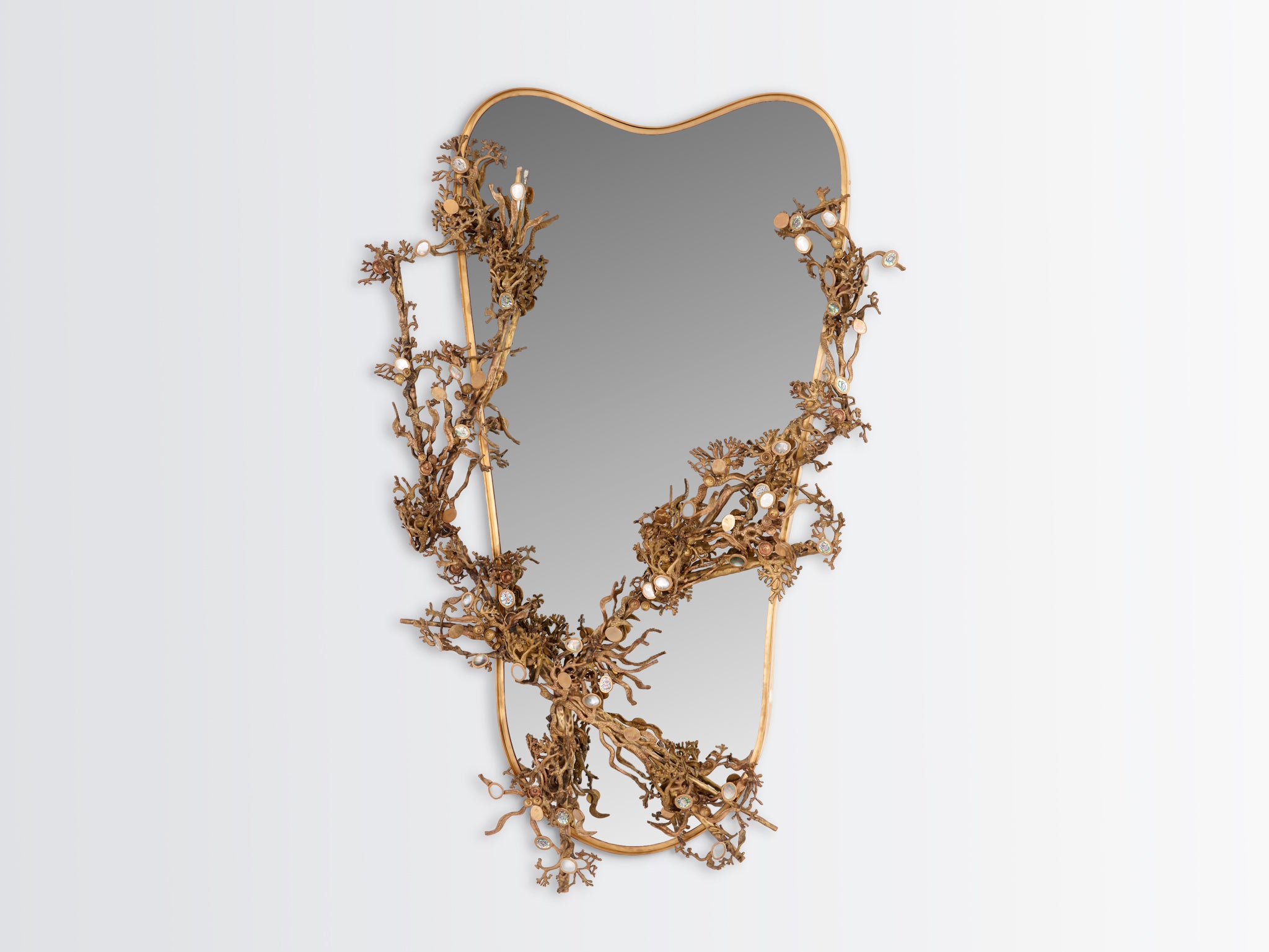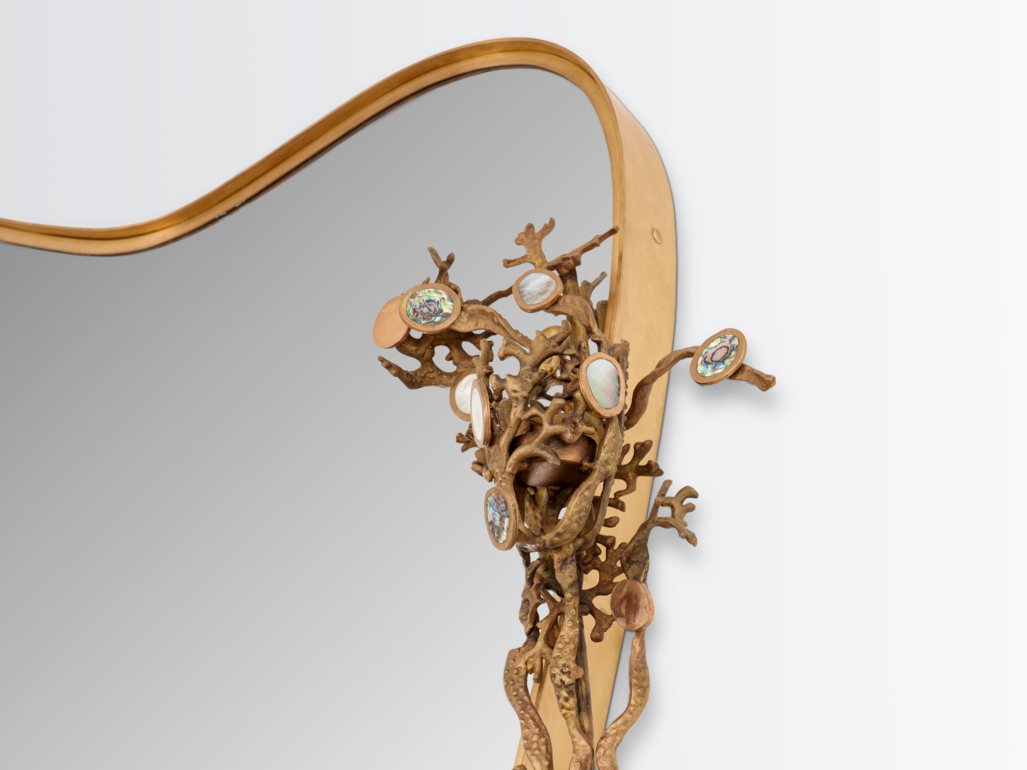 Inspired by the lush, flowering branches of the Japanese Sakura in springtime, this Baroque-style mirror features cast brass branches entwined around its frame. The Cherry Blossoms—which are delicate ornamental flowers—are represented by highlights of semi-precious stones like green abalone and white mother of pearl inlaid in highly polished brass.