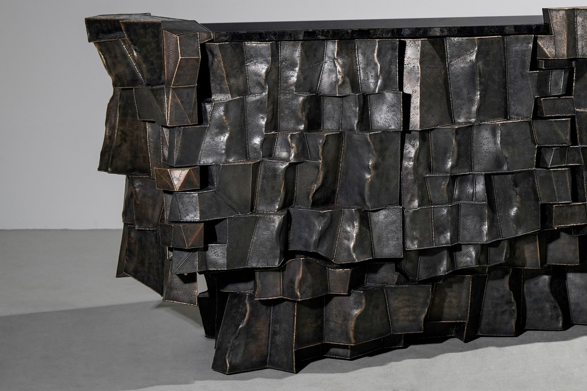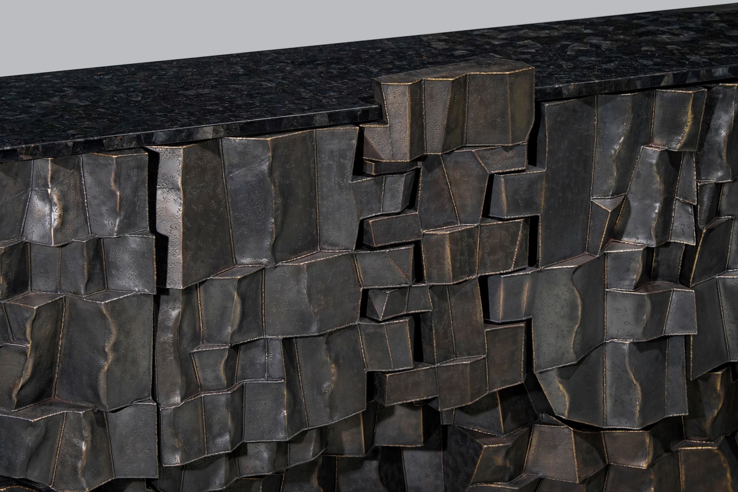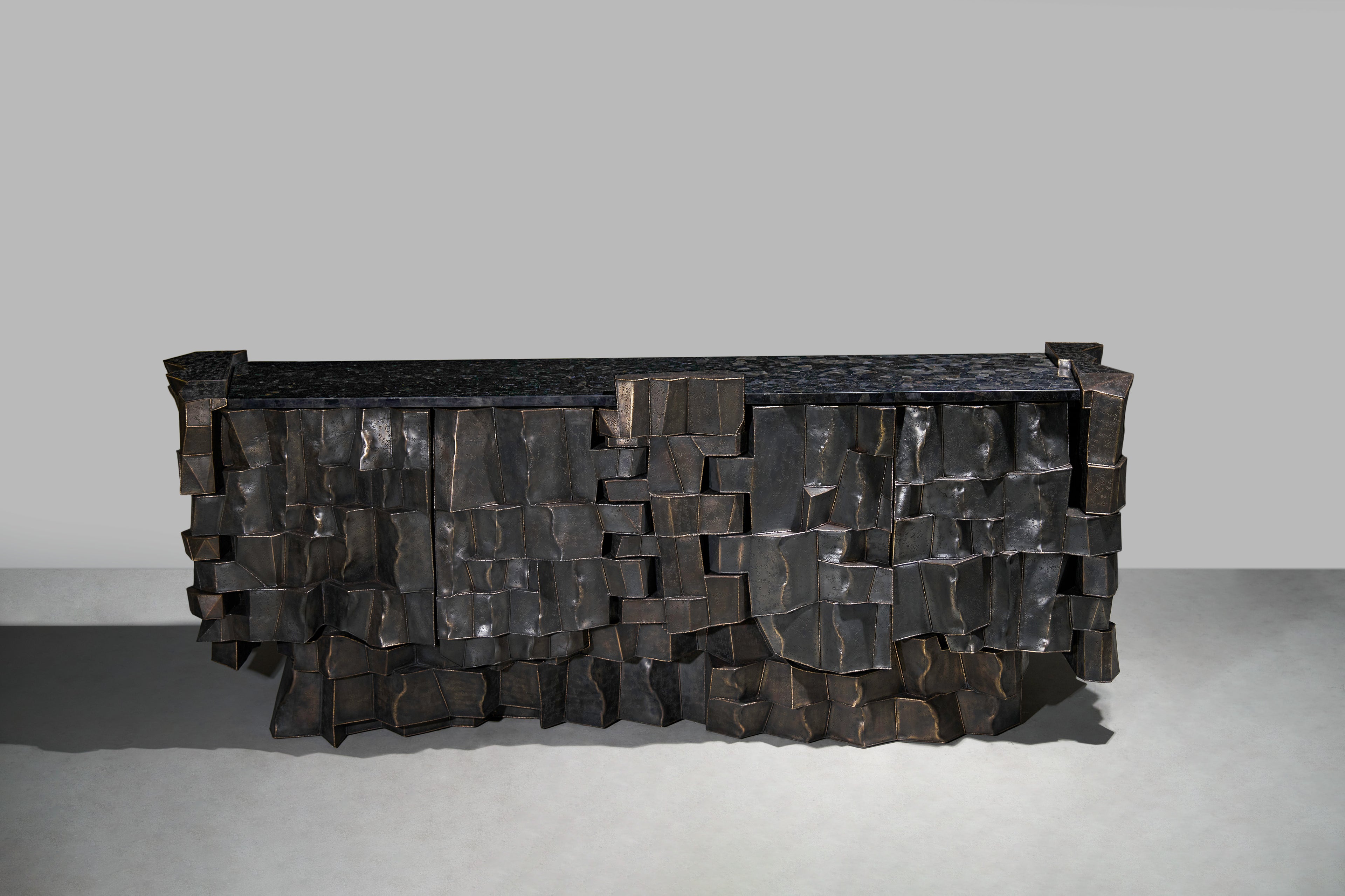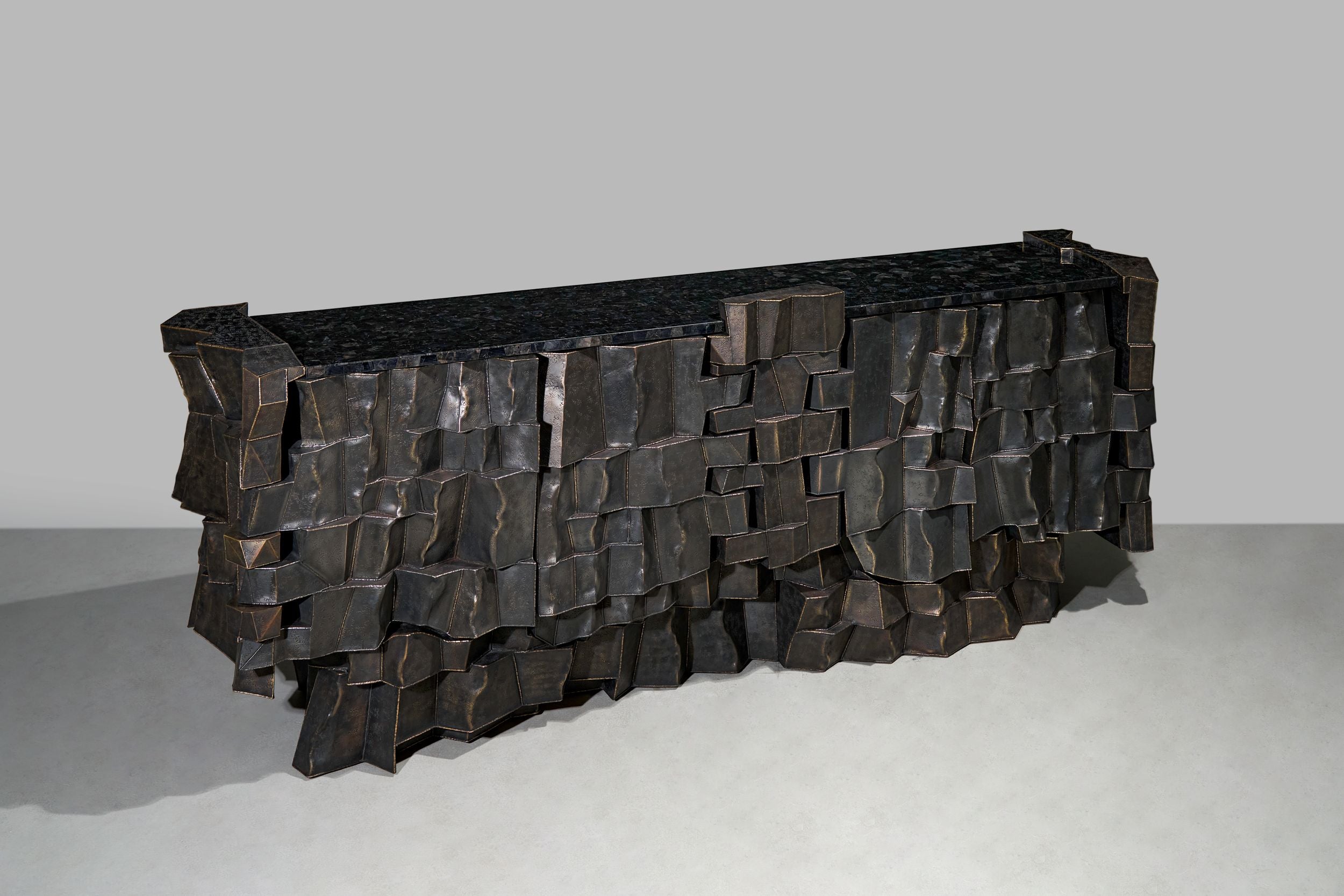 Through a dialogue of materials, this collection evokes the natural geometry of graphite formations. Metal sheets are fused using hollowed joinery to create a faceted structure of sharp planes and shifting volumes—simultaneously raw and refined.