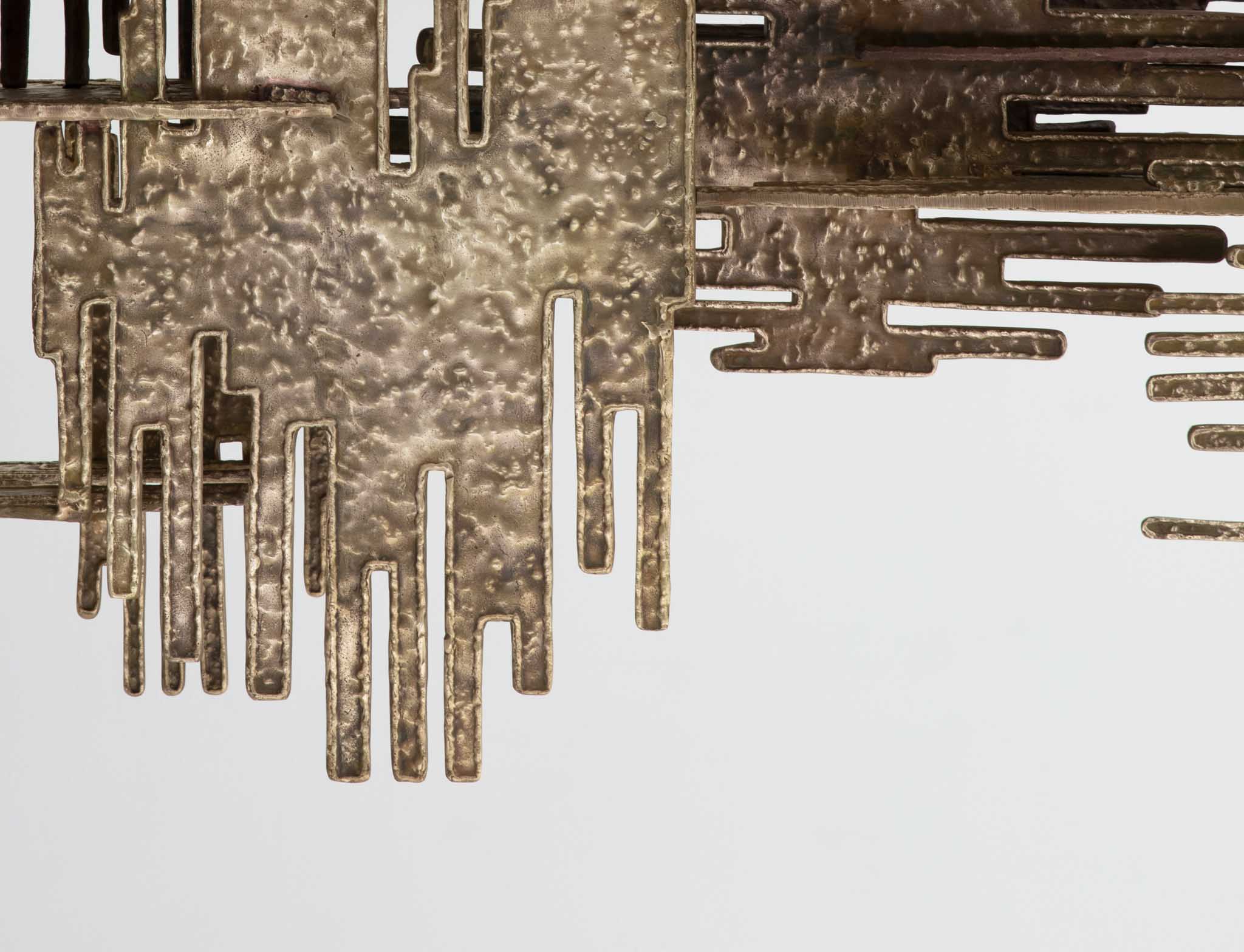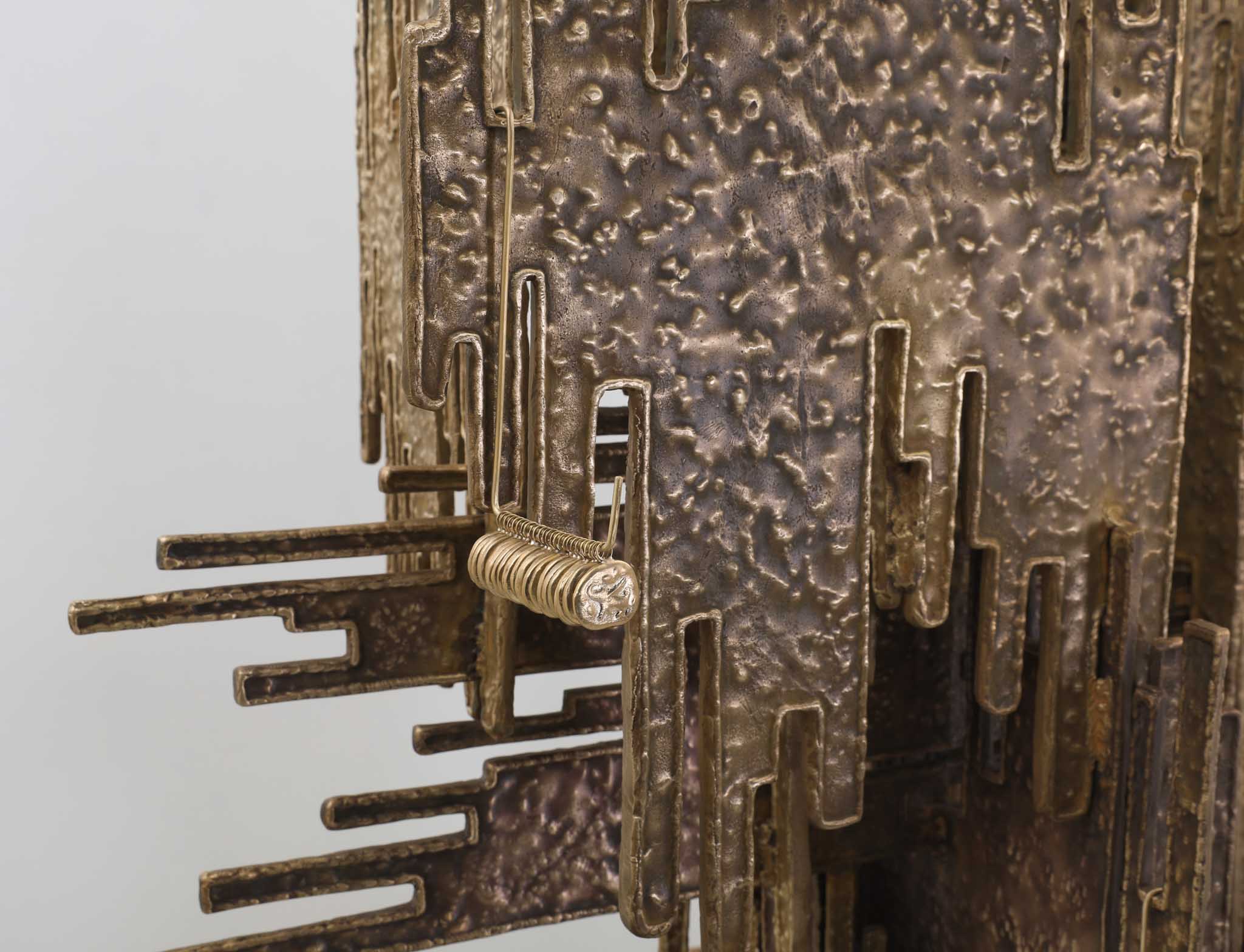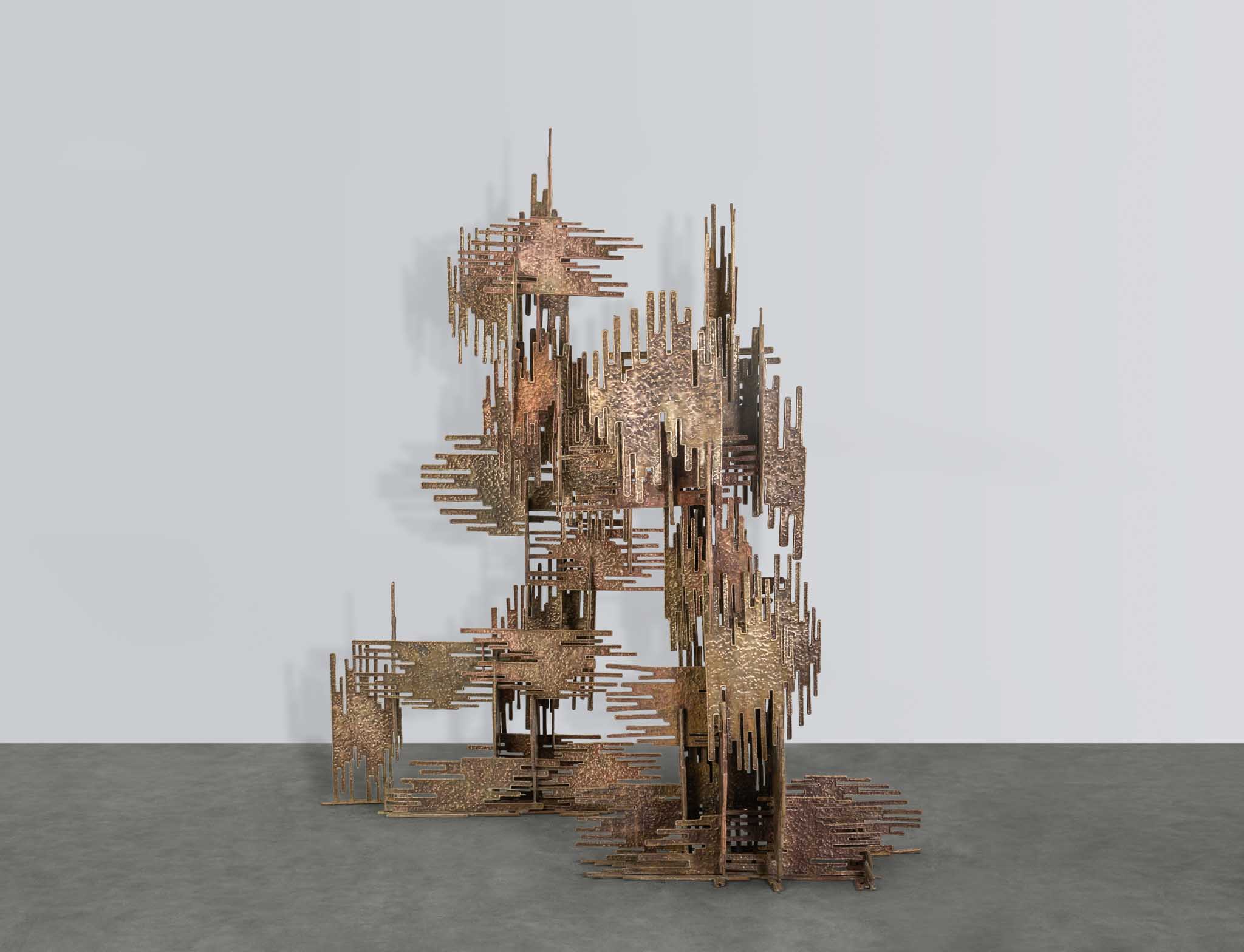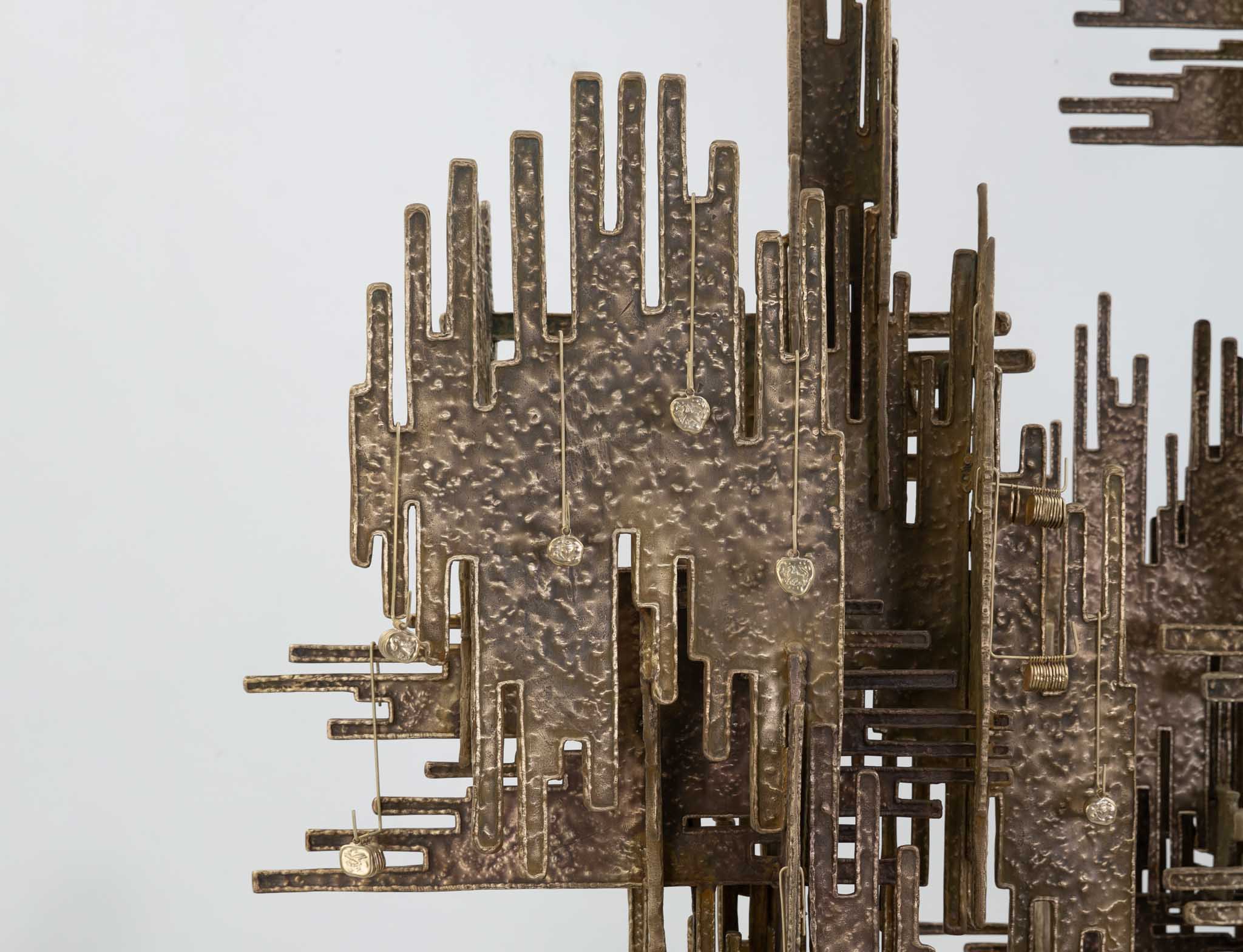 Fluid, dynamic forms are frozen in close embrace in this multifaceted Brutalist sculpture. Made by welding cast metal sheets, The Tree of Good Fortune is a versatile piece that can be displayed as a sculpture, used as furniture as a room divider, or as a floor lamp.